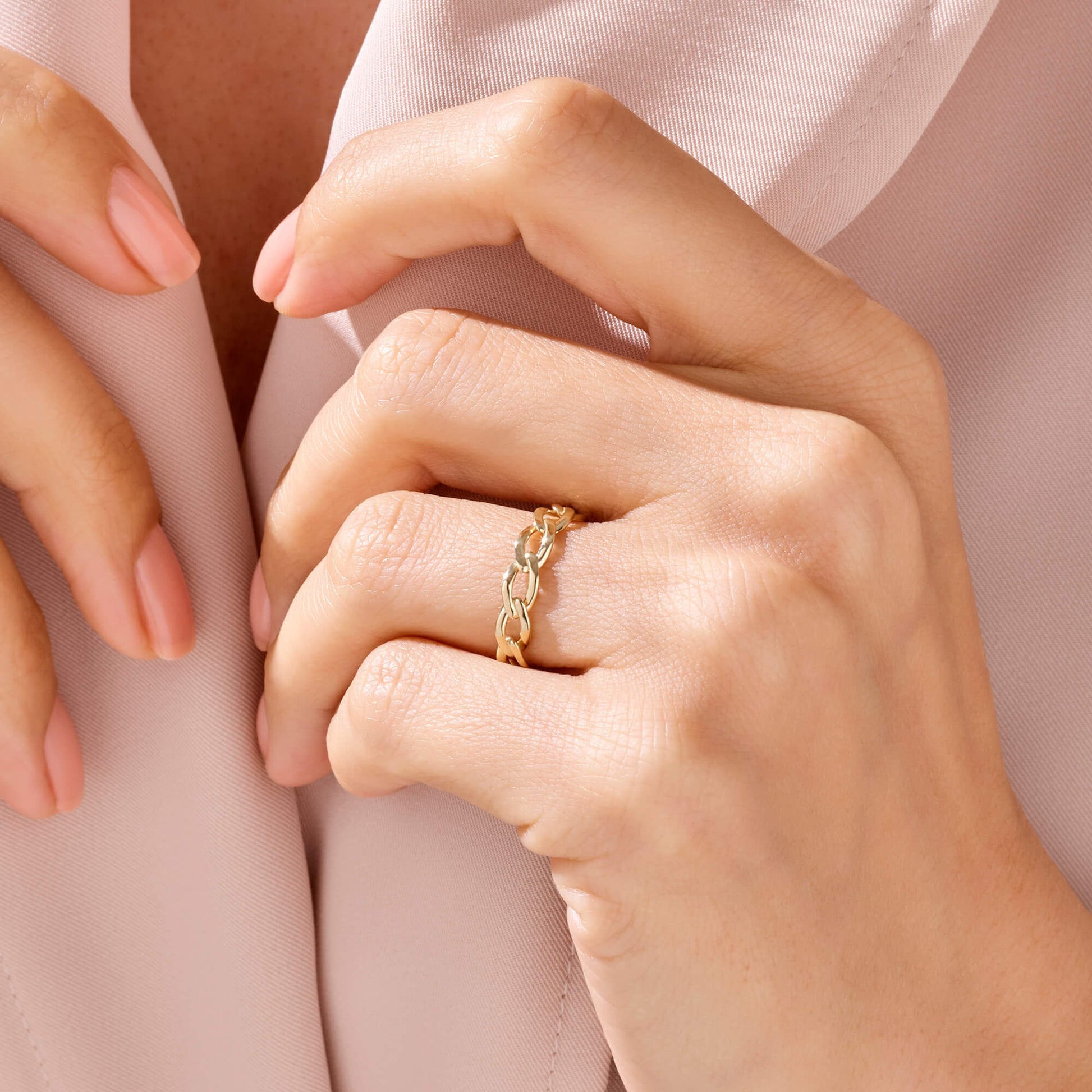 The Bold Chain Ring, which you can create an elegant style with which brings a characteristic atmosphere to your style with the unique stance of the chains and the luminous appearance of the gold. The Bold Chain Ring is the expression of the most meaningful and beautiful emotions, which is formed by embroidering the gold elegantly.