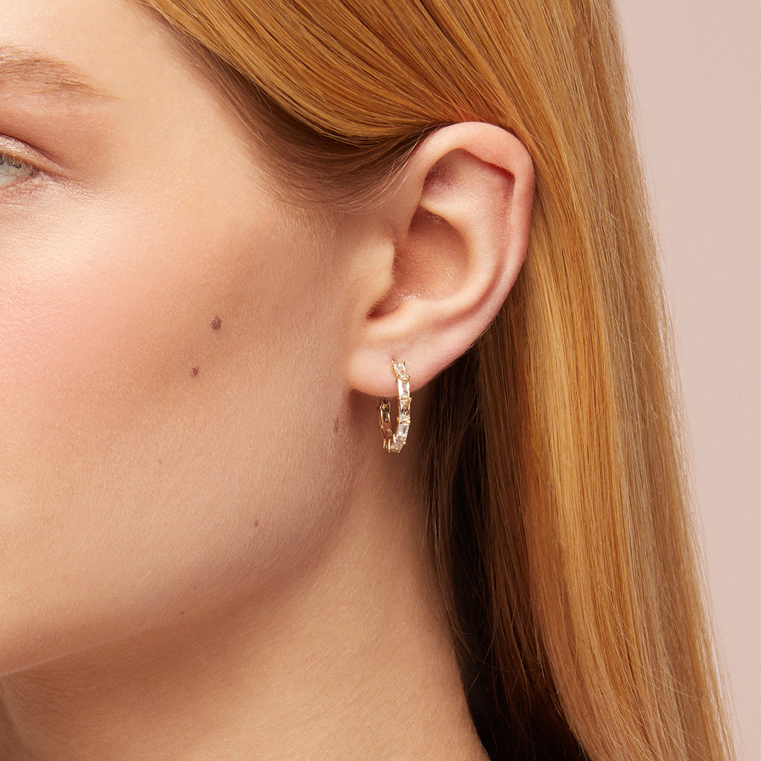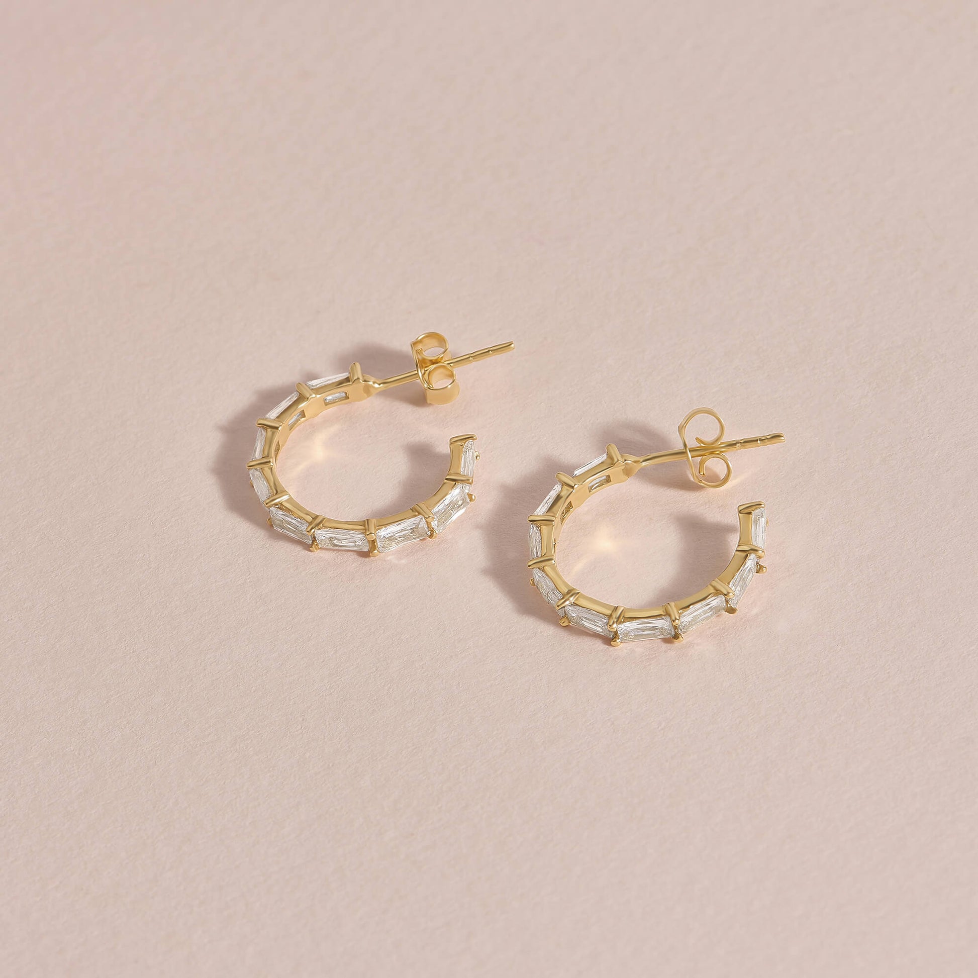 The Alternating Baguette Earrings are Megan's magnum opus of elegant earrings with a unique style. The sparkling stones stand out when it meets the splendour of gold. The Alternating Baguette Earrings, extensively demonstrate a conspicuous glow with brilliant stones, will look astonishing in your slender ears.