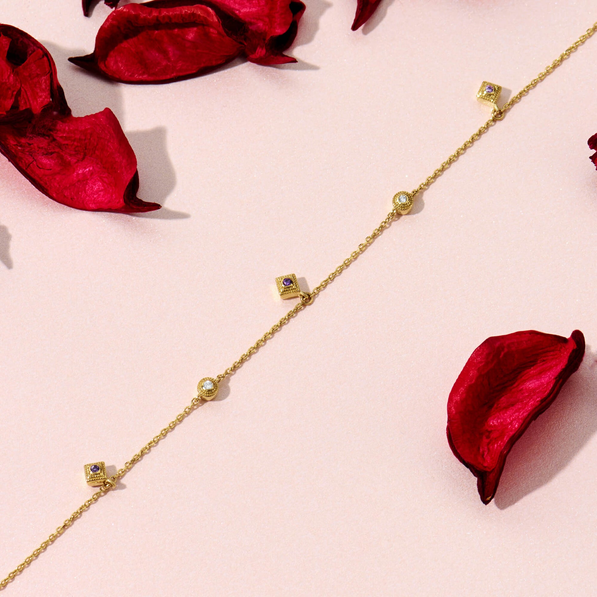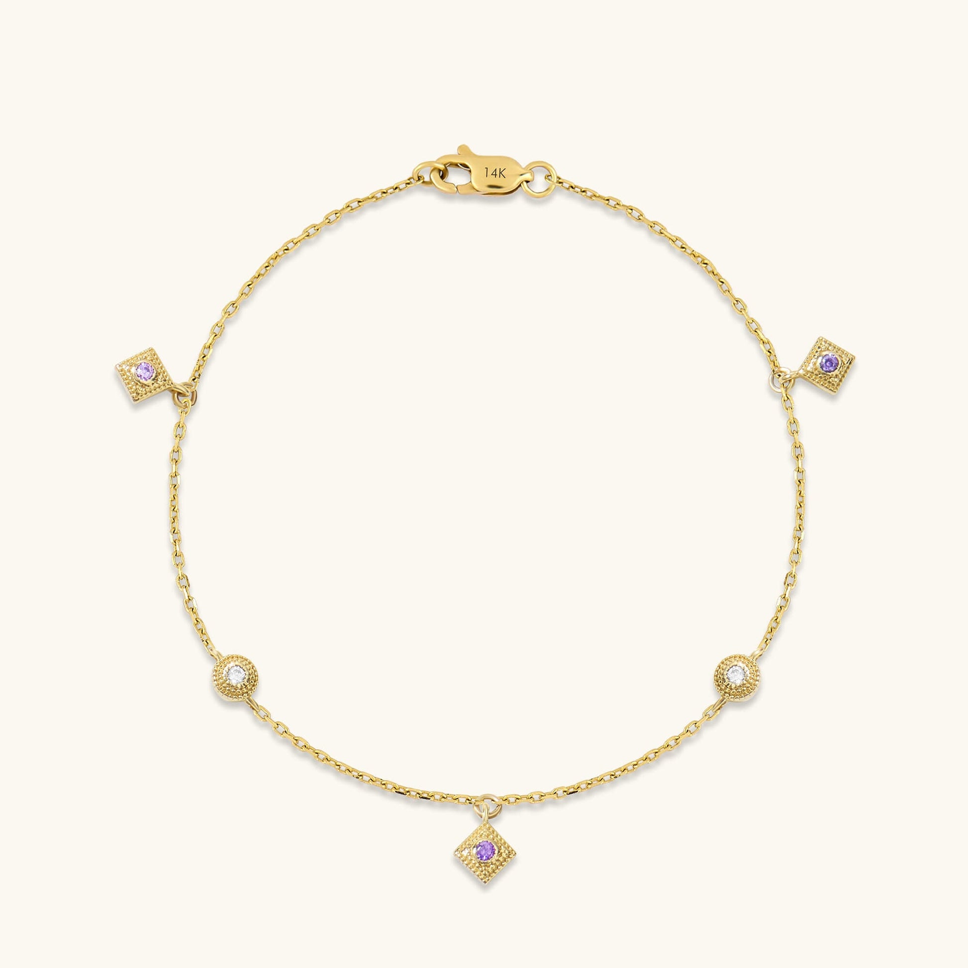 This bracelet pairs minimalist craftsmanship with emotive beauty. The Amethyst Talisman Bracelet features amethyst and sparkling stones , offering a touch of luxe that never overpowers. Add this piece to your look and let its quiet presence speak your truth.
