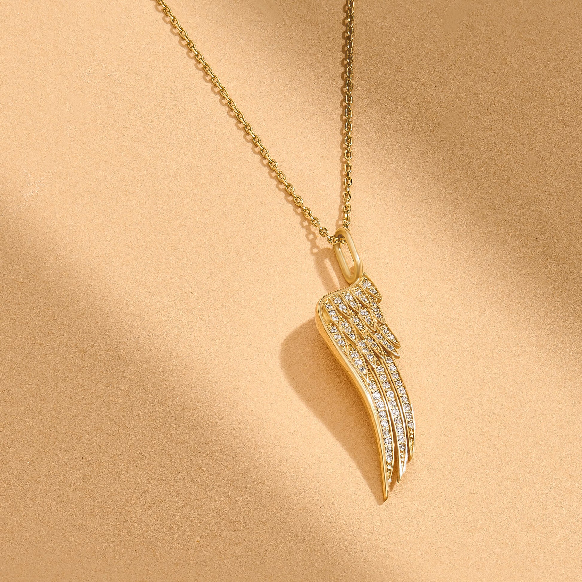 Adorn yourself with the elegance of our Angel Wing Diamond Necklace. Each delicate feather, meticulously crafted from solid gold and adorned with sparkling diamonds, embodies the ethereal beauty of angelic wings. Let this exquisite piece serve as a reminder of the divine protection and grace that surrounds you.