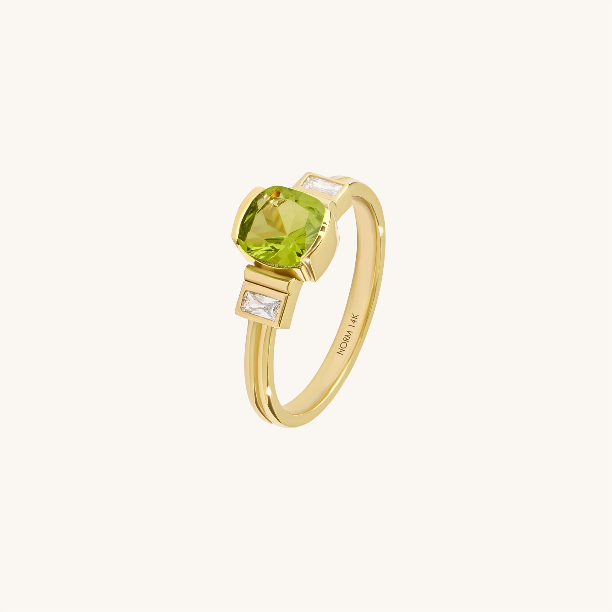 Discover timeless allure with our Art Deco Peridot Ring in Gold. The cushion-cut peridot gemstone takes center stage, radiating elegance and charm. Crafted in fine 14K gold, this ring is a perfect blend of vintage sophistication and contemporary style. Adorn your hand with a touch of luxury and grace.