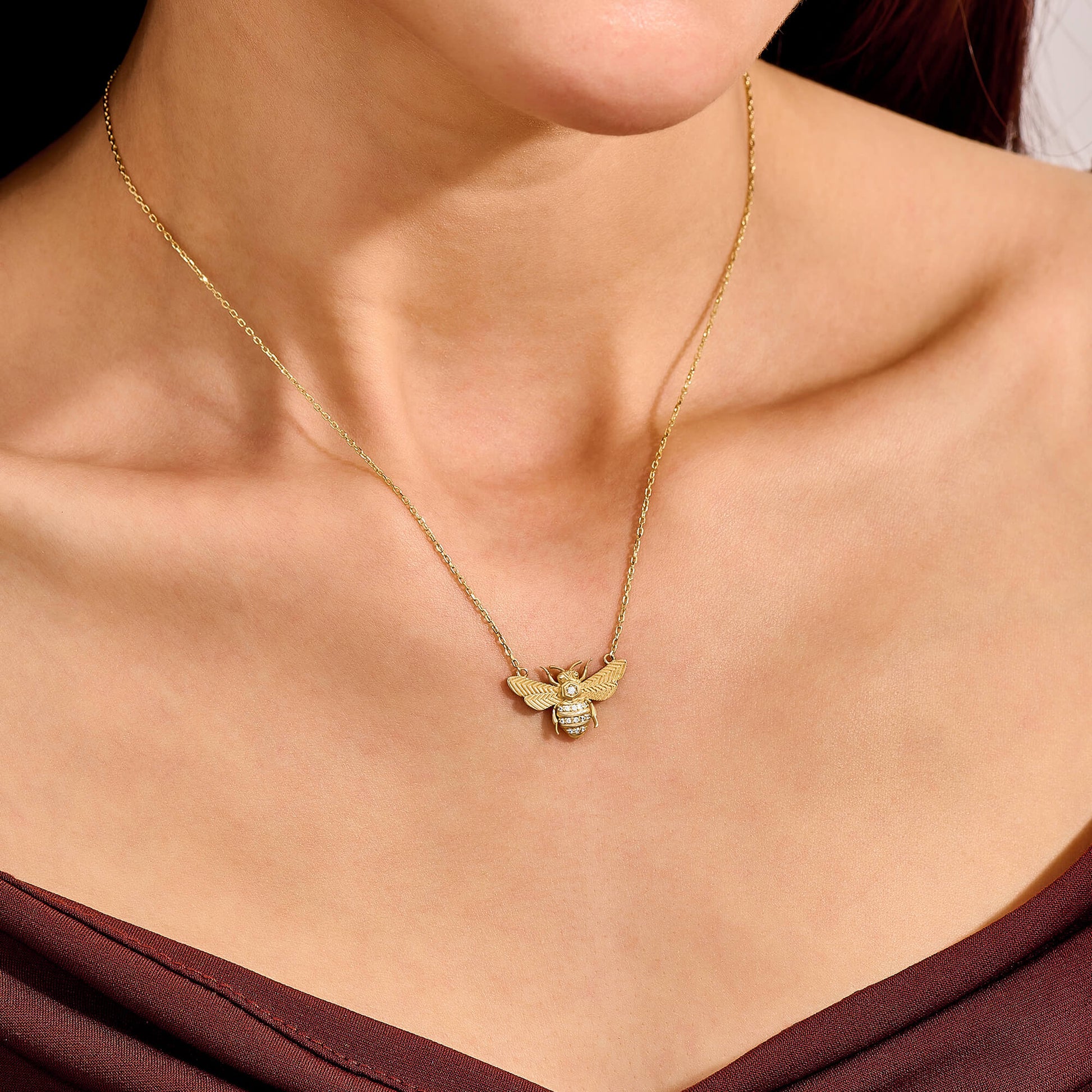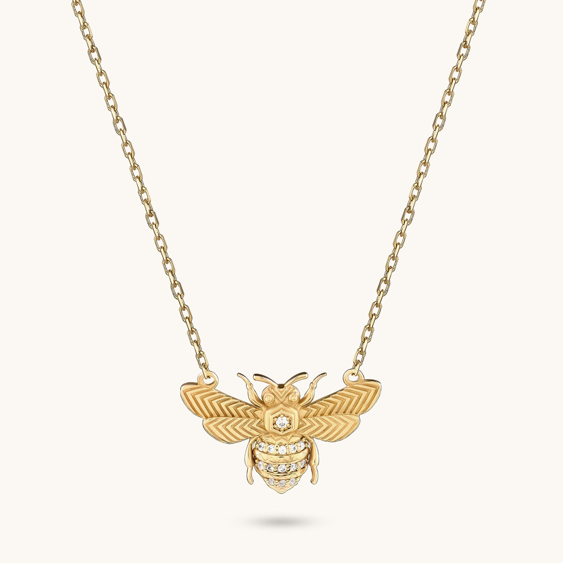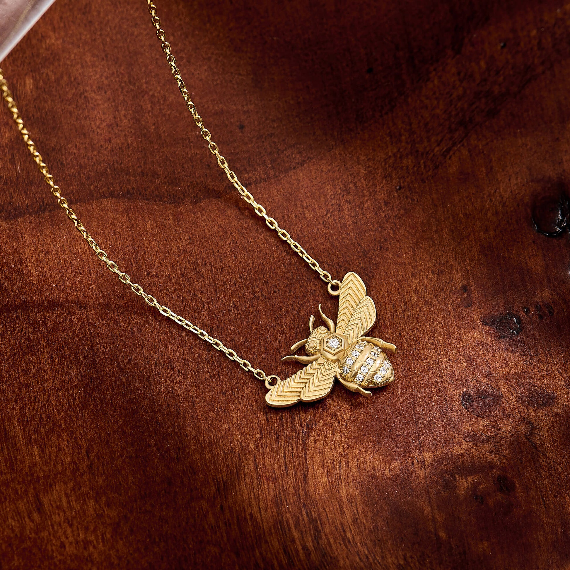 Indulge in the enchanting beauty of nature with our Diamond Bee Necklace. Featuring a realistic bee pendant adorned with shimmering diamonds, it captures the essence of delicate elegance and natural charm. Make a bold statement and elevate your style with this stunning accessory.