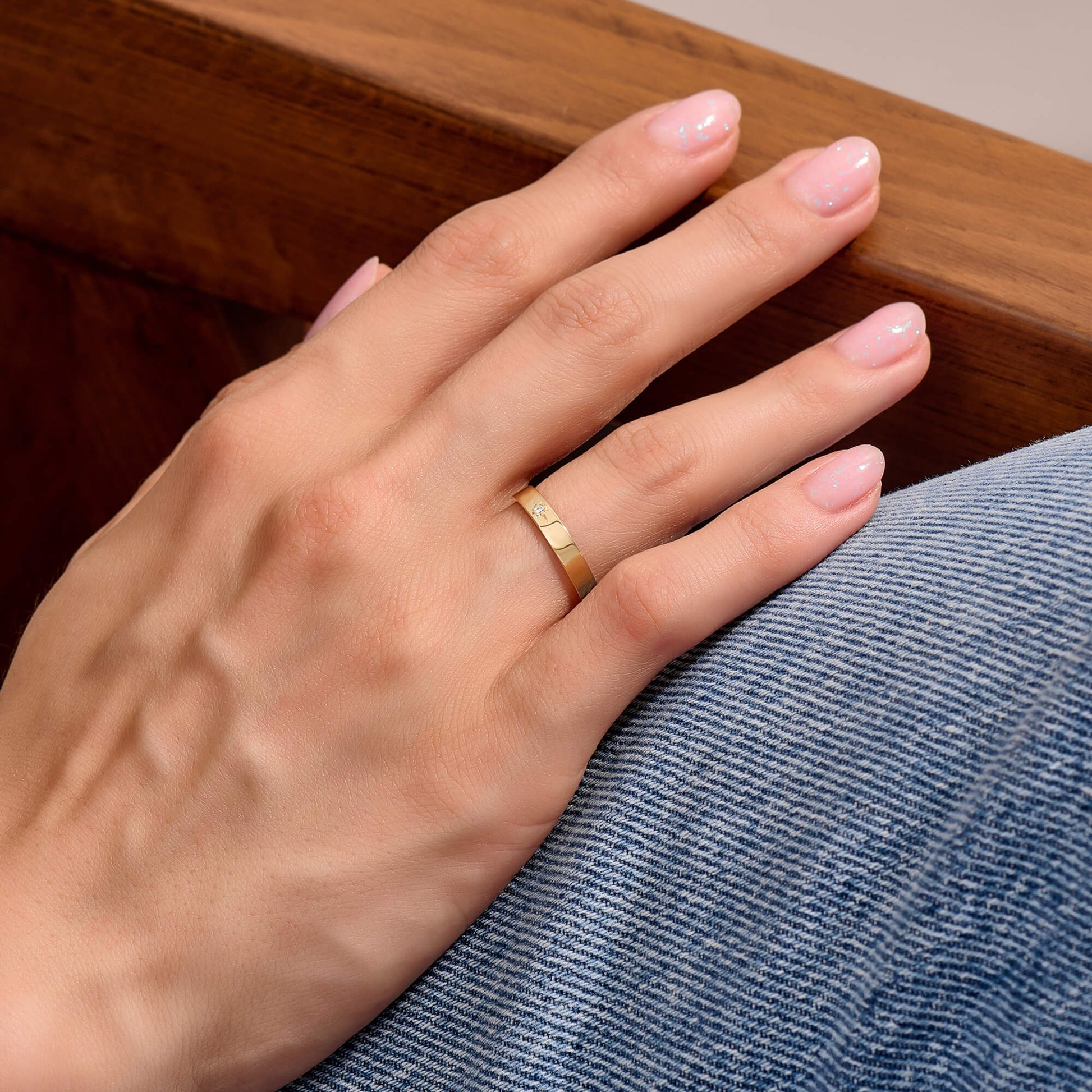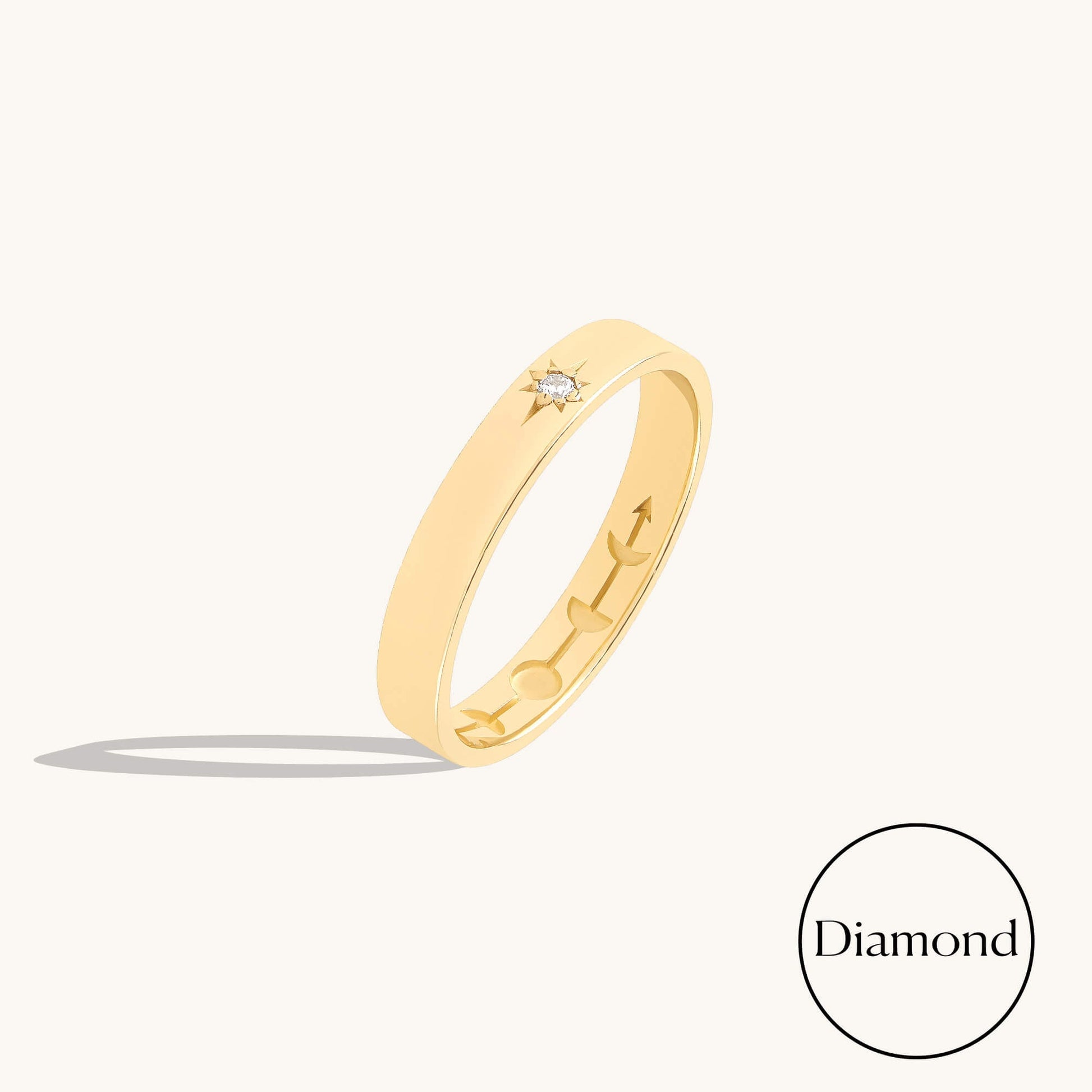 Inspired by the rhythm of the universe, the Diamond Moon Phase Starburst Band features lunar curves on the inside and radiant starburst on the outside for a design full of movement and light. A modern celestial treasure that layers beautifully or shines on its own, echoing the elegance of the night sky.