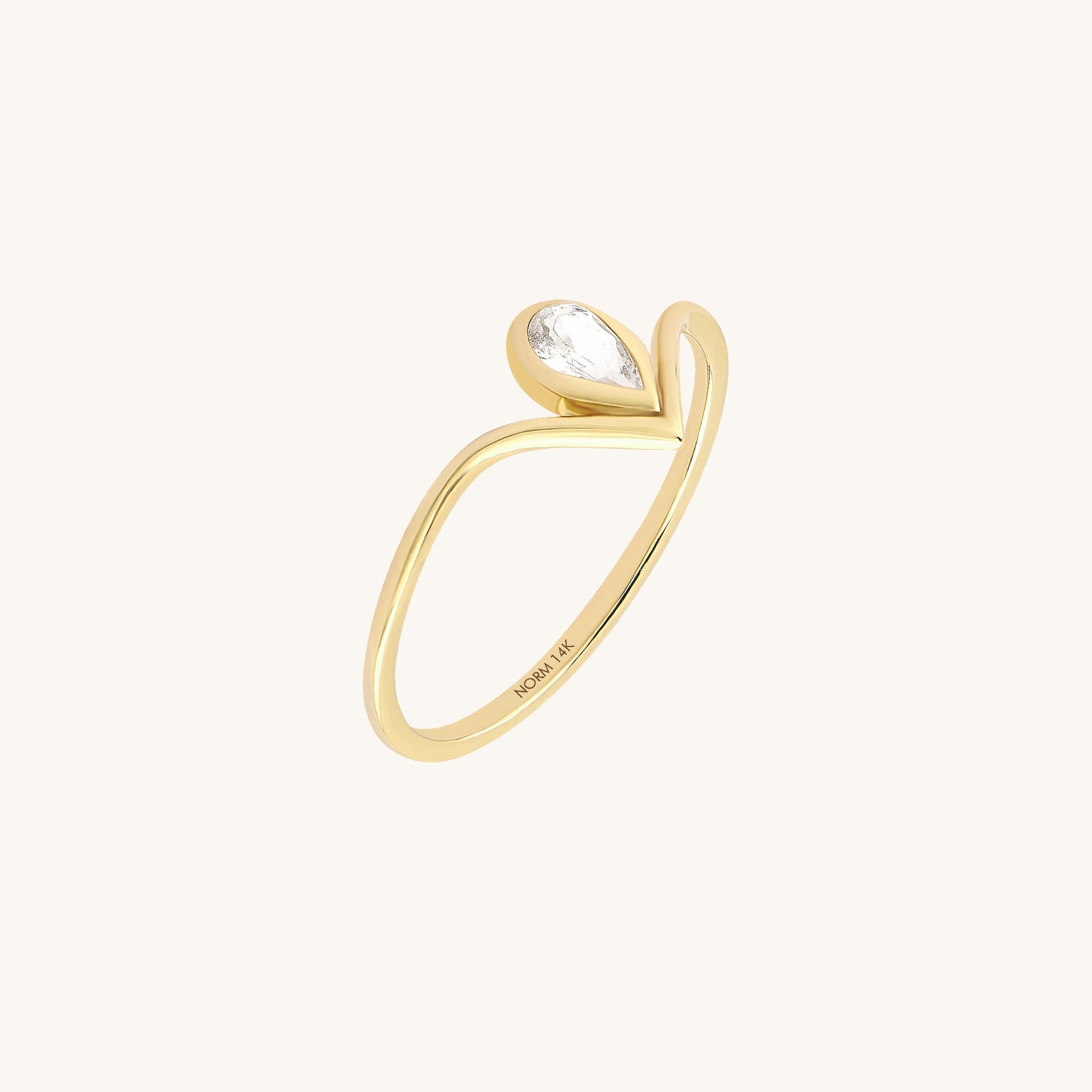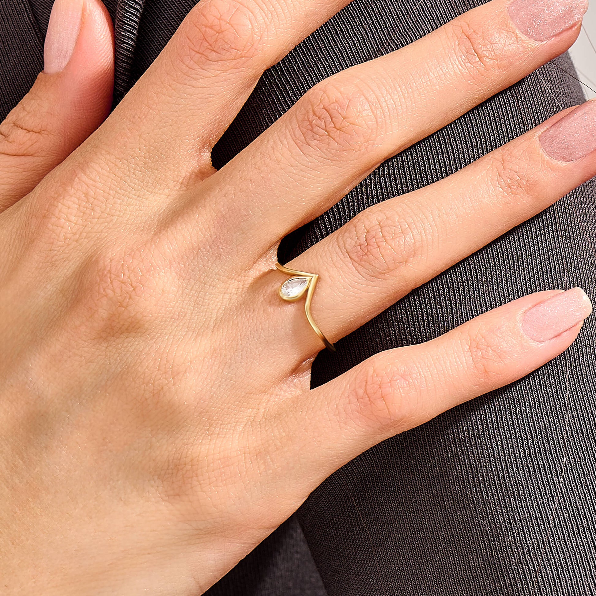 Our Diamond Pear Drop Chevron Ring features a bezel-set pear diamond, radiating brilliance. Framed by the graceful curve of the chevron motif, this ring exudes sophistication and modern allure. Its unique blend of classic charm and contemporary flair makes it a versatile statement piece that elevates any ensemble, from casual to formal occasions.