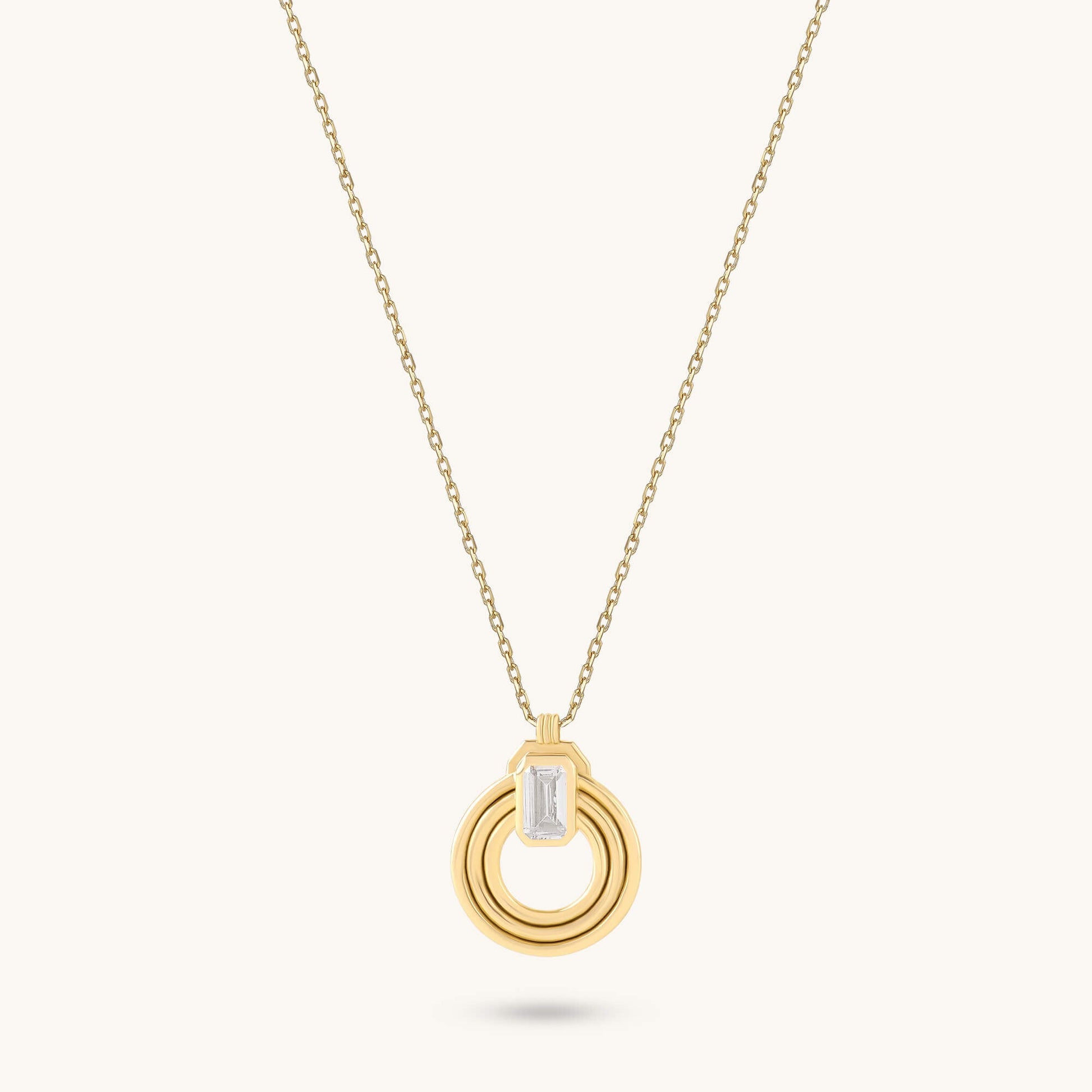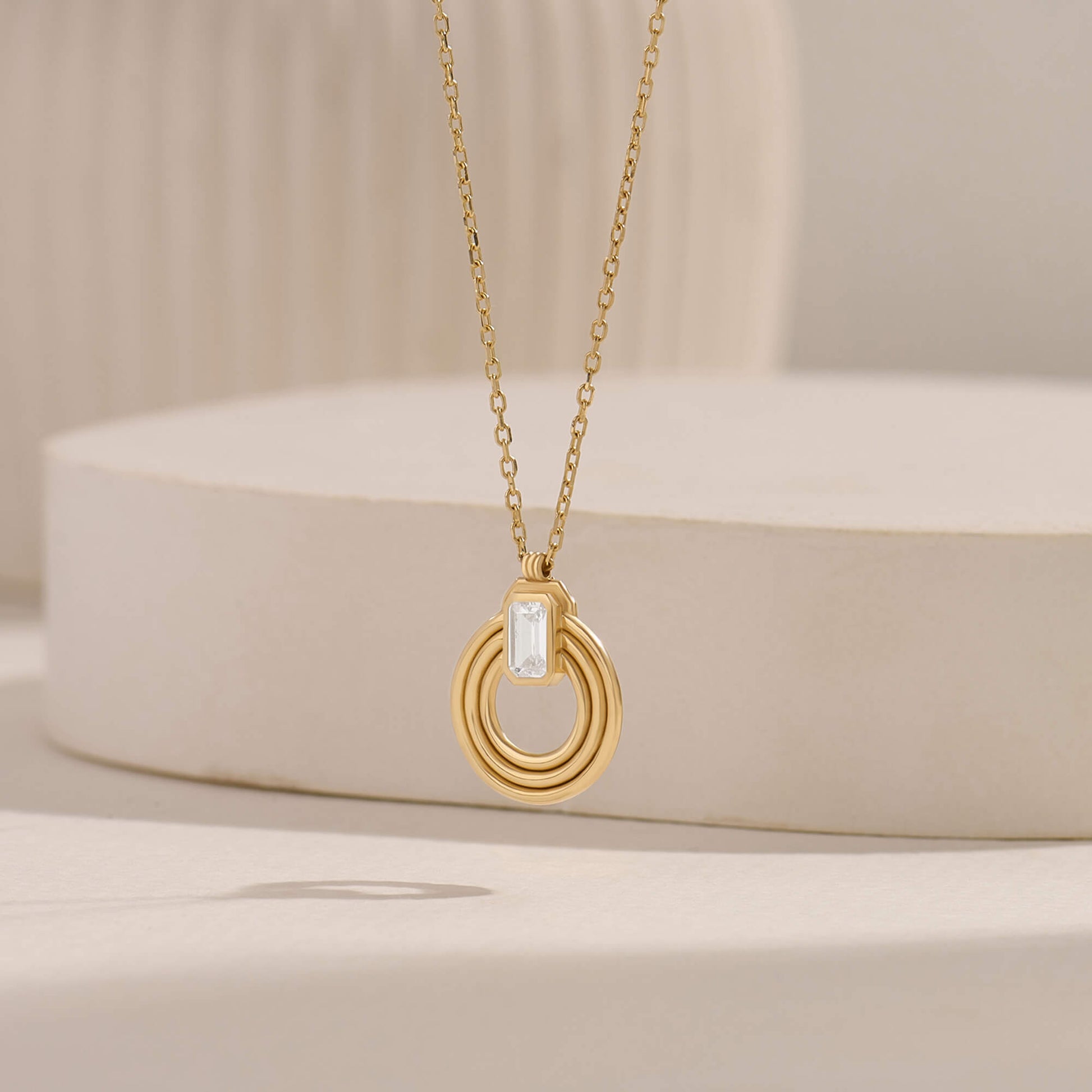 The Emerald-Cut Moissanite Orbit Loop Necklace captures timeless elegance with a modern twist. Its interlocking circular pendant, accented by a sleek emerald-cut moissanite, creates a refined design that radiates balance, harmony, and subtle brilliance.