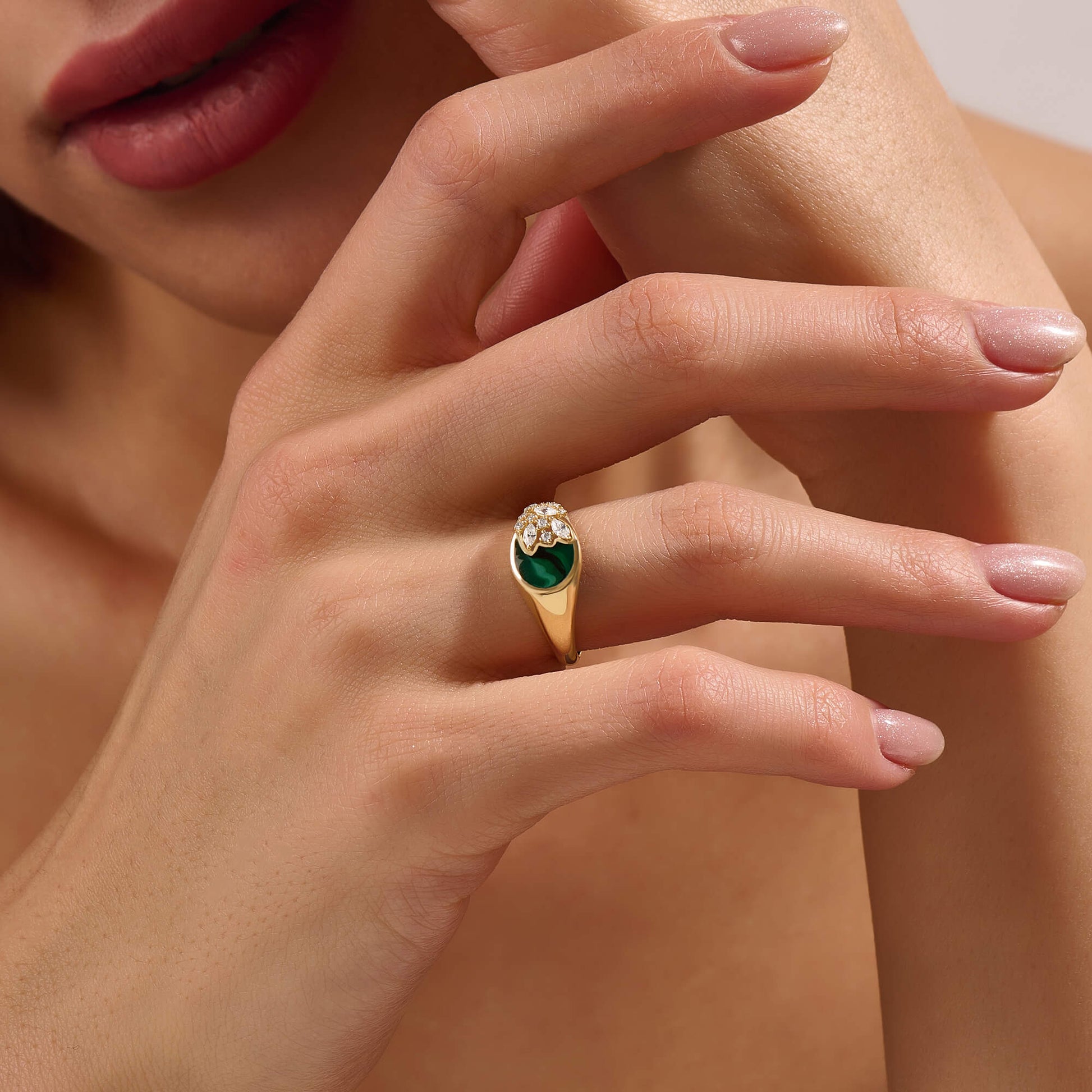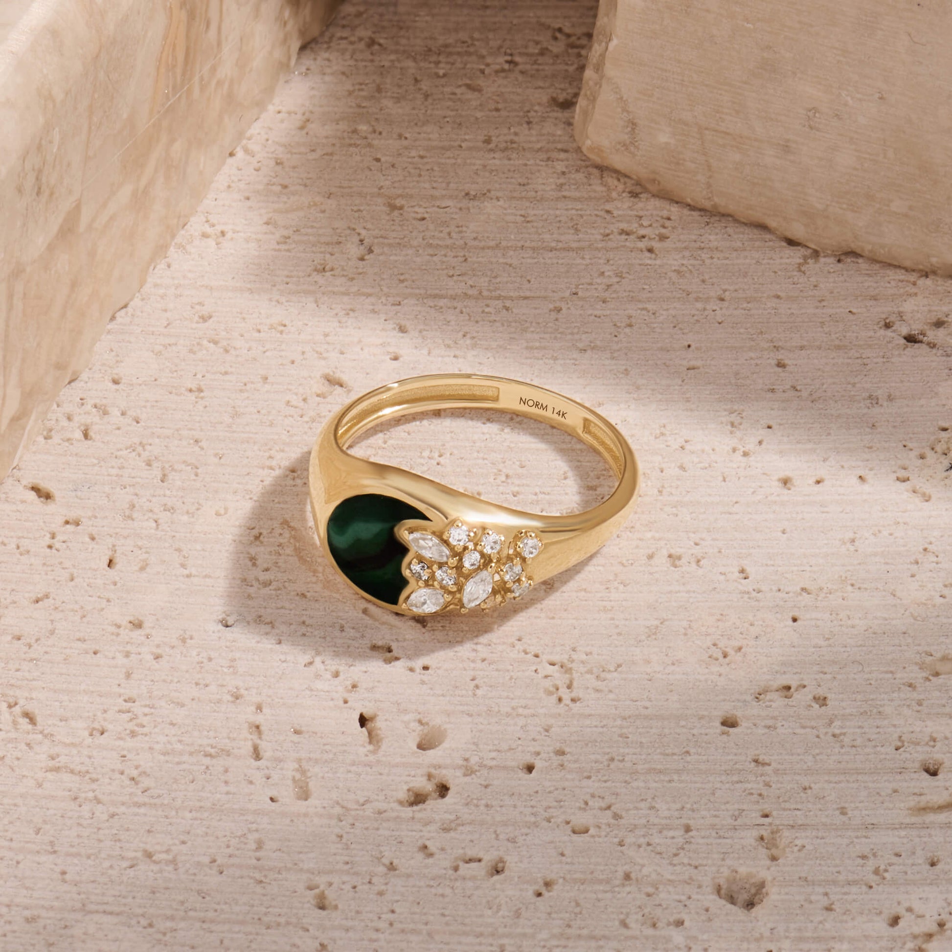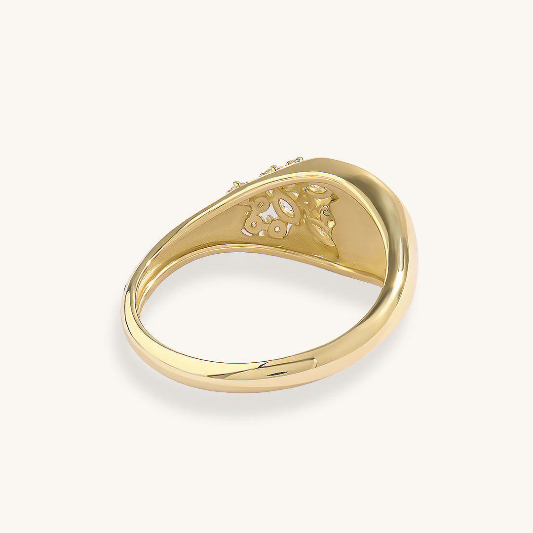 Green Enamel Blossom Signet Ring in Gold