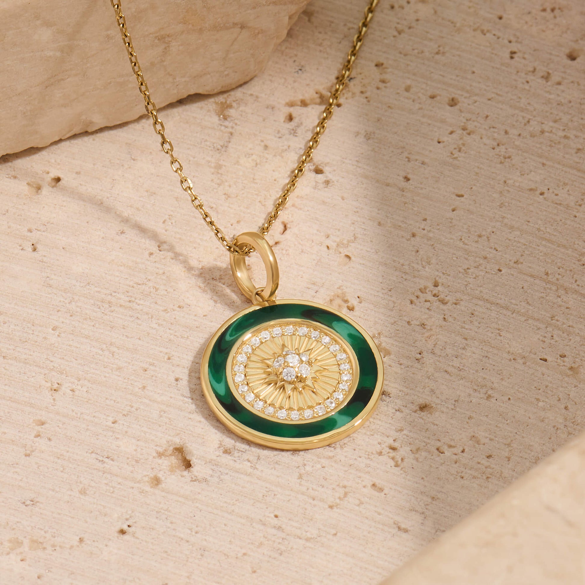 Bask in the glow of our Green Enamel Sunburst Coin Necklace, a radiant blend of celestial charm and timeless elegance. This exquisite necklace features a captivating sunburst motif intricately designed on a green enamel coin pendant. Symbolizing positivity and vitality, this necklace is a unique and elegant addition to your collection.