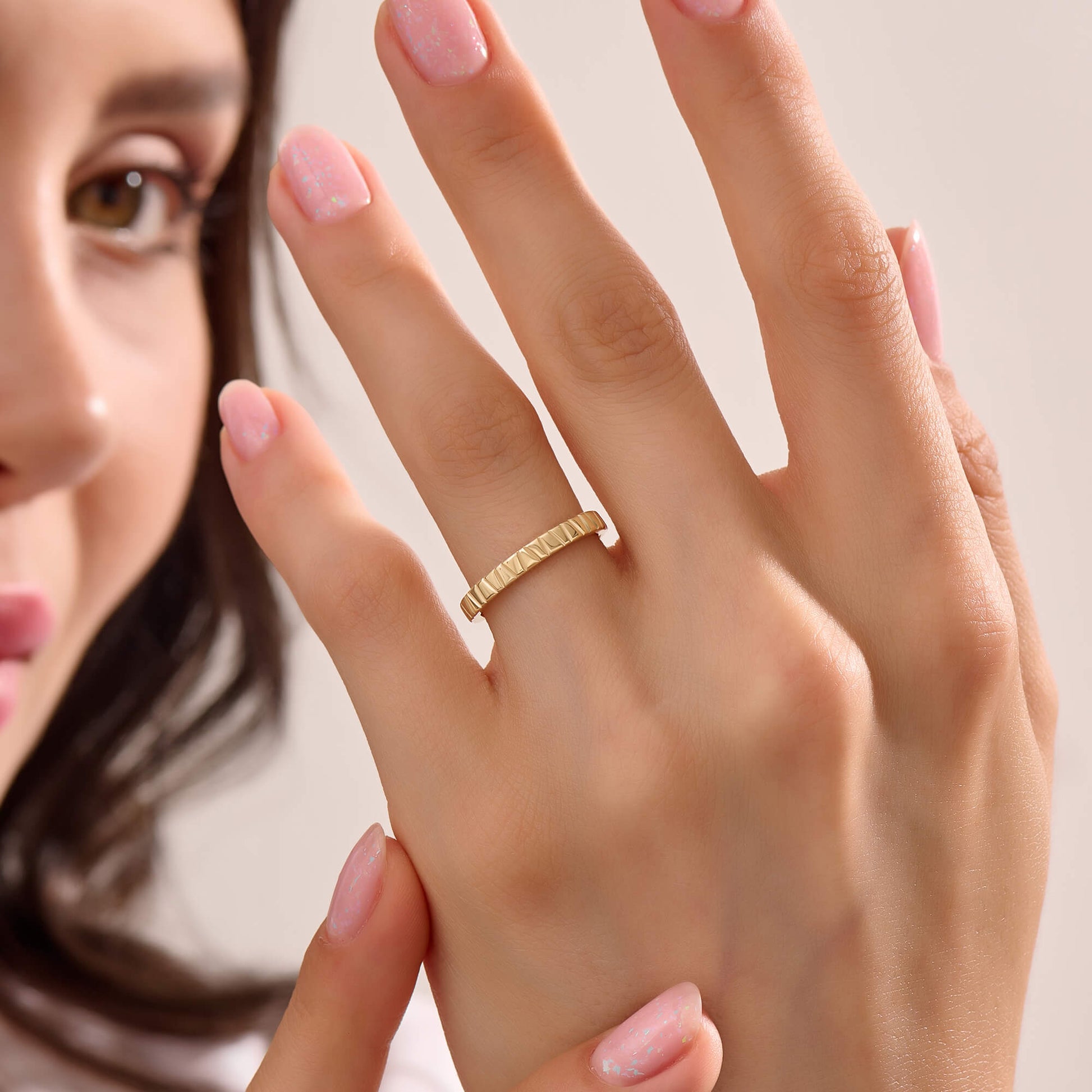 Refined yet contemporary, the Groove Band Ring features delicately carved grooves across its surface for a textured, eye-catching finish. Perfect for layering with other bands or wearing solo, this ring brings elegance and modern style to any look.