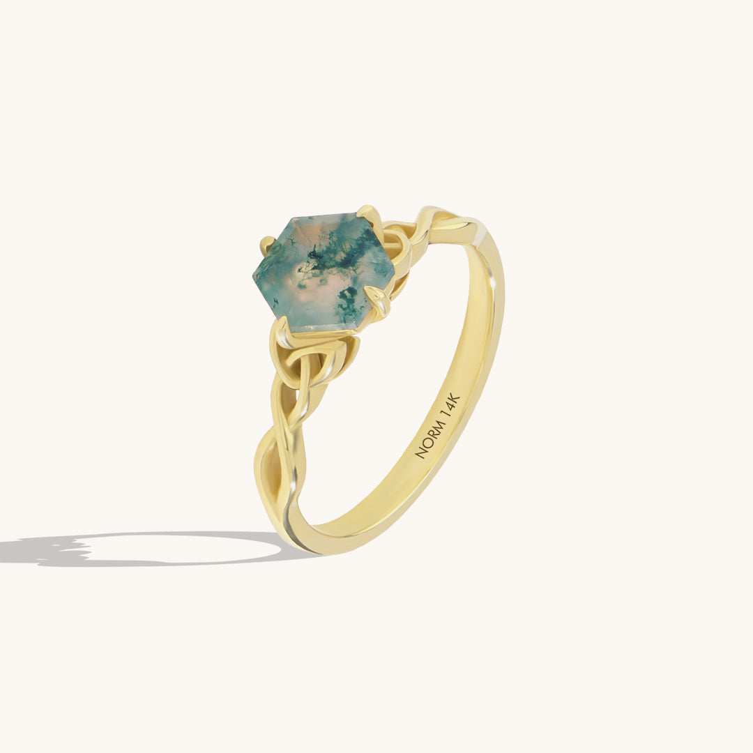 Discover the enchanting Hexagon Moss Agate Celtic Solitaire Ring, a perfect blend of nature's splendor and Celtic symbolism. Embrace the mesmerizing green hues and delicate moss-like inclusions of the hexagon-shaped Moss Agate gem. Meticulously crafted with rich meaning, this cherished ring is destined to be treasured for a lifetime.