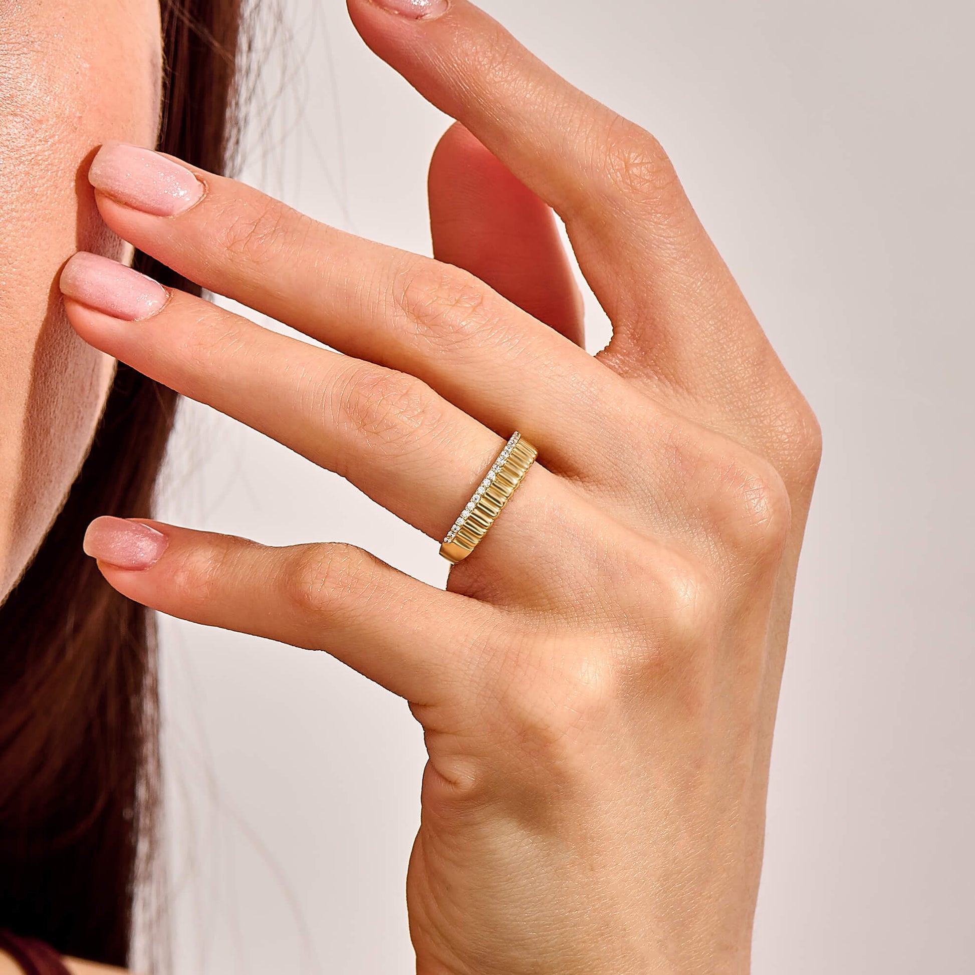 Our Iconic Diamond Half Eternity Band features a sleek line design adorned with a line of dazzling pave diamonds. This thick wedding band offers a perfect balance of elegance and sparkle, making it a versatile accessory for any occasion.