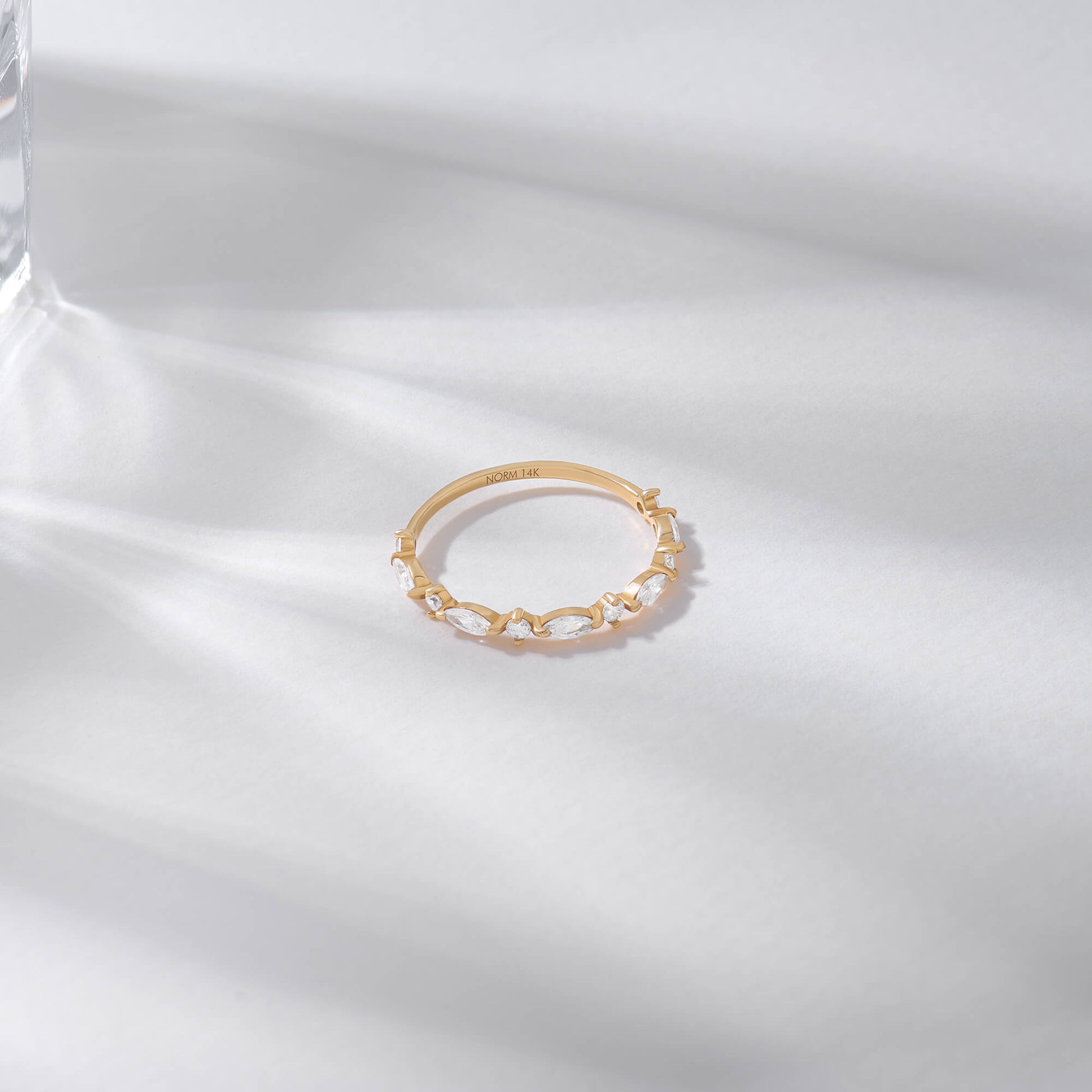 The Marquise Band Ring radiates elegance with its row of marquise-cut lab-grown diamonds set in warm gold. Each stone catches the light beautifully, adding a graceful sparkle to every gesture.