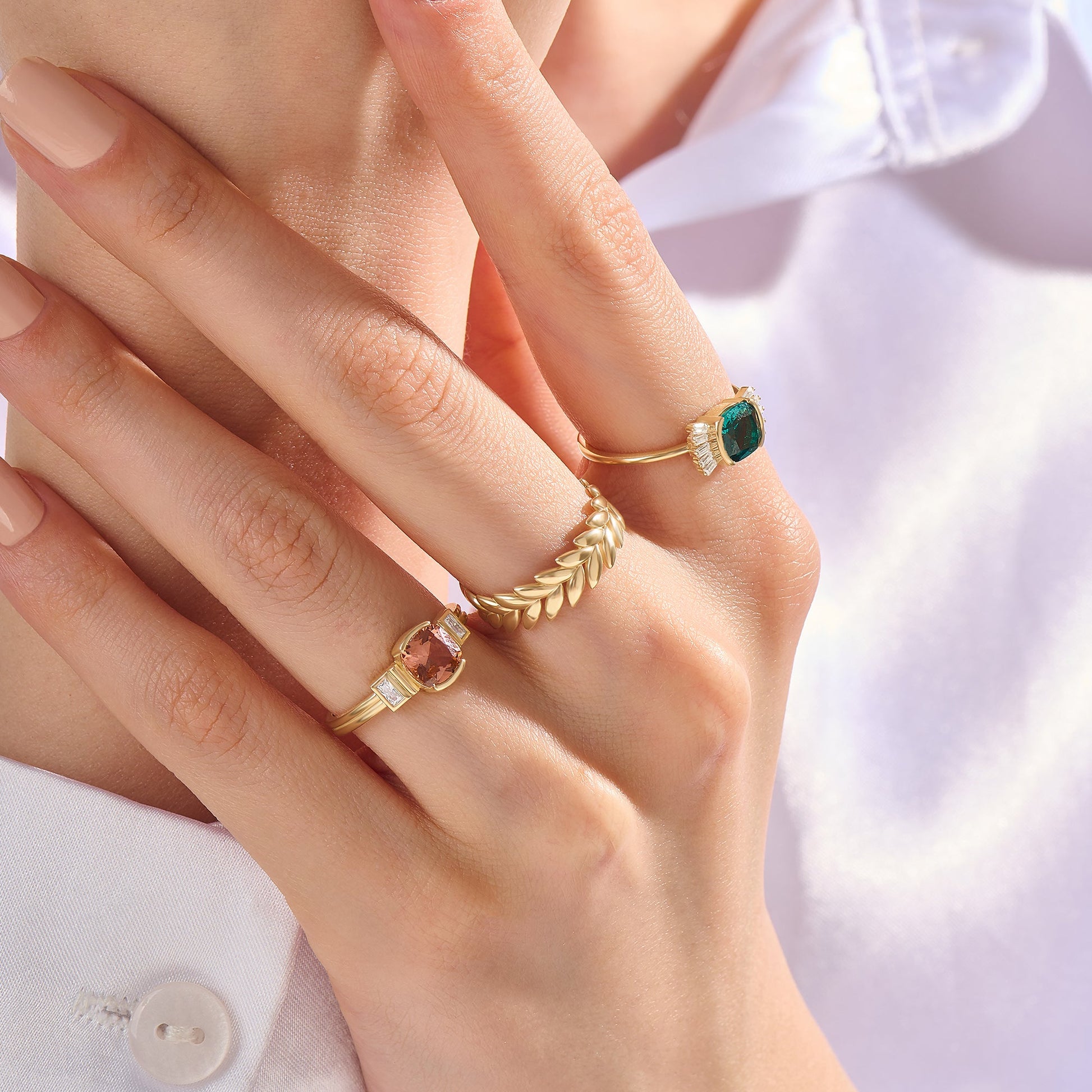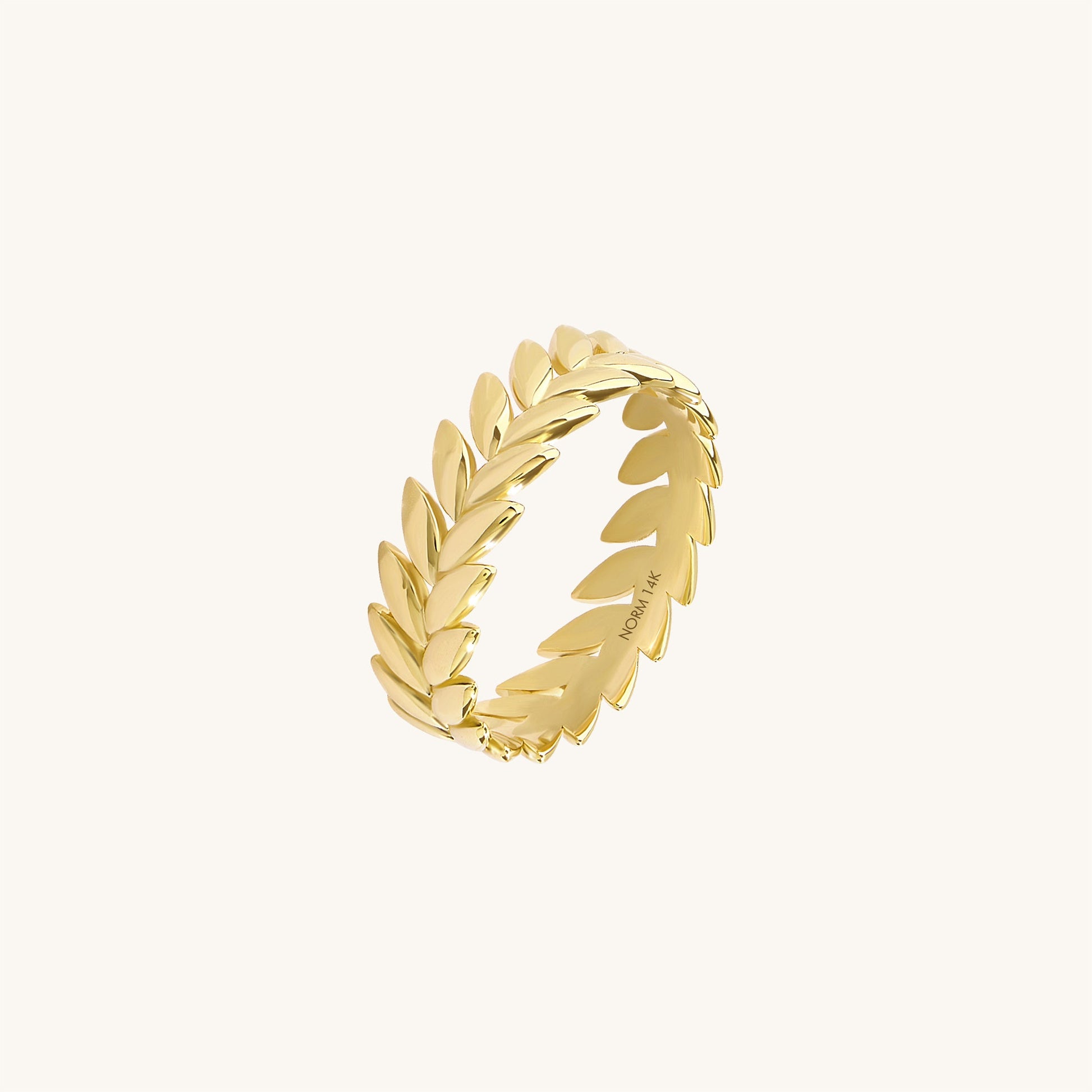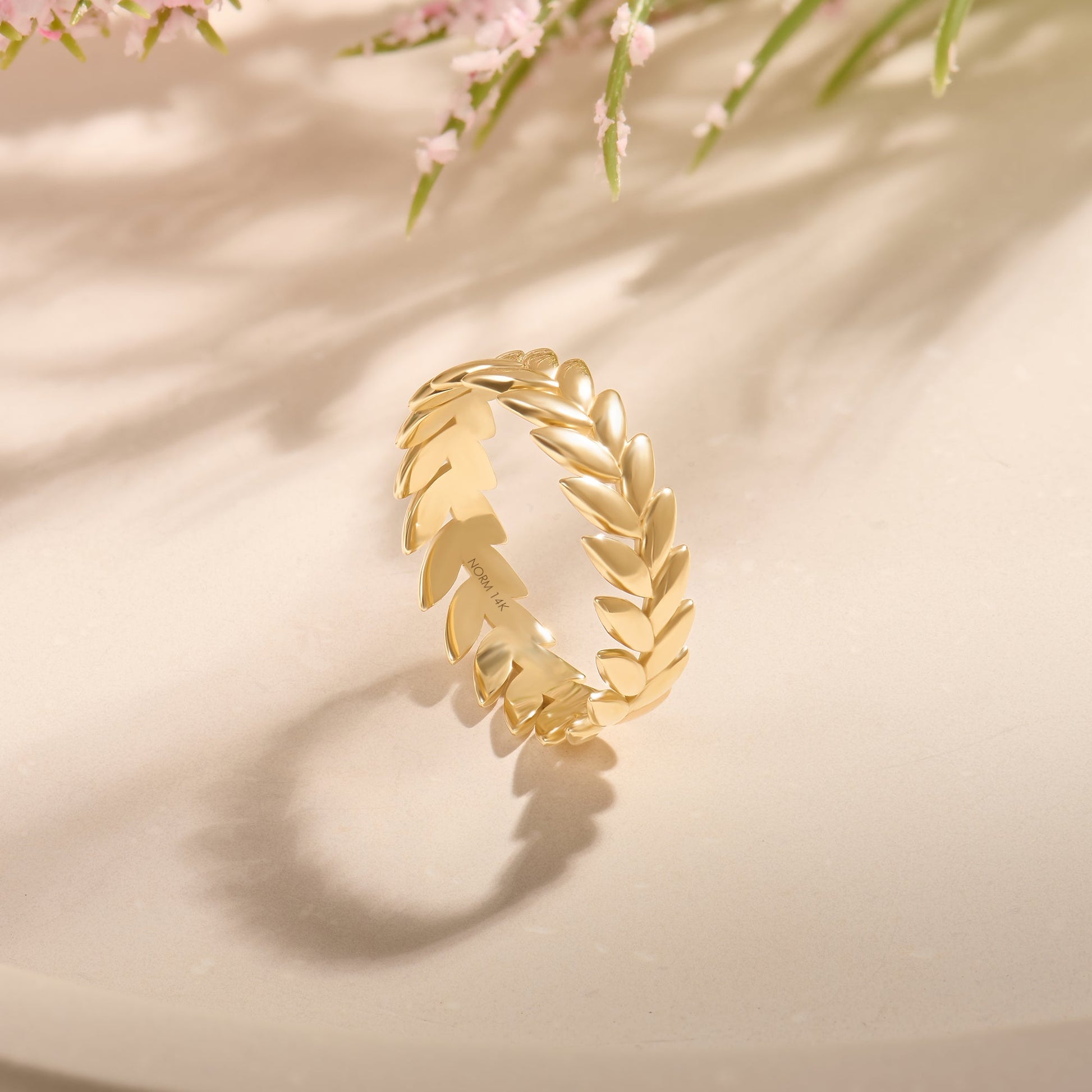 Embrace nature's elegance with our Laurel Wreath Band Ring. The intricately crafted laurel leaves wrap around your finger, symbolizing victory and honor. Crafted in lustrous gold, this ring is a unique blend of nature-inspired beauty and timeless style.
