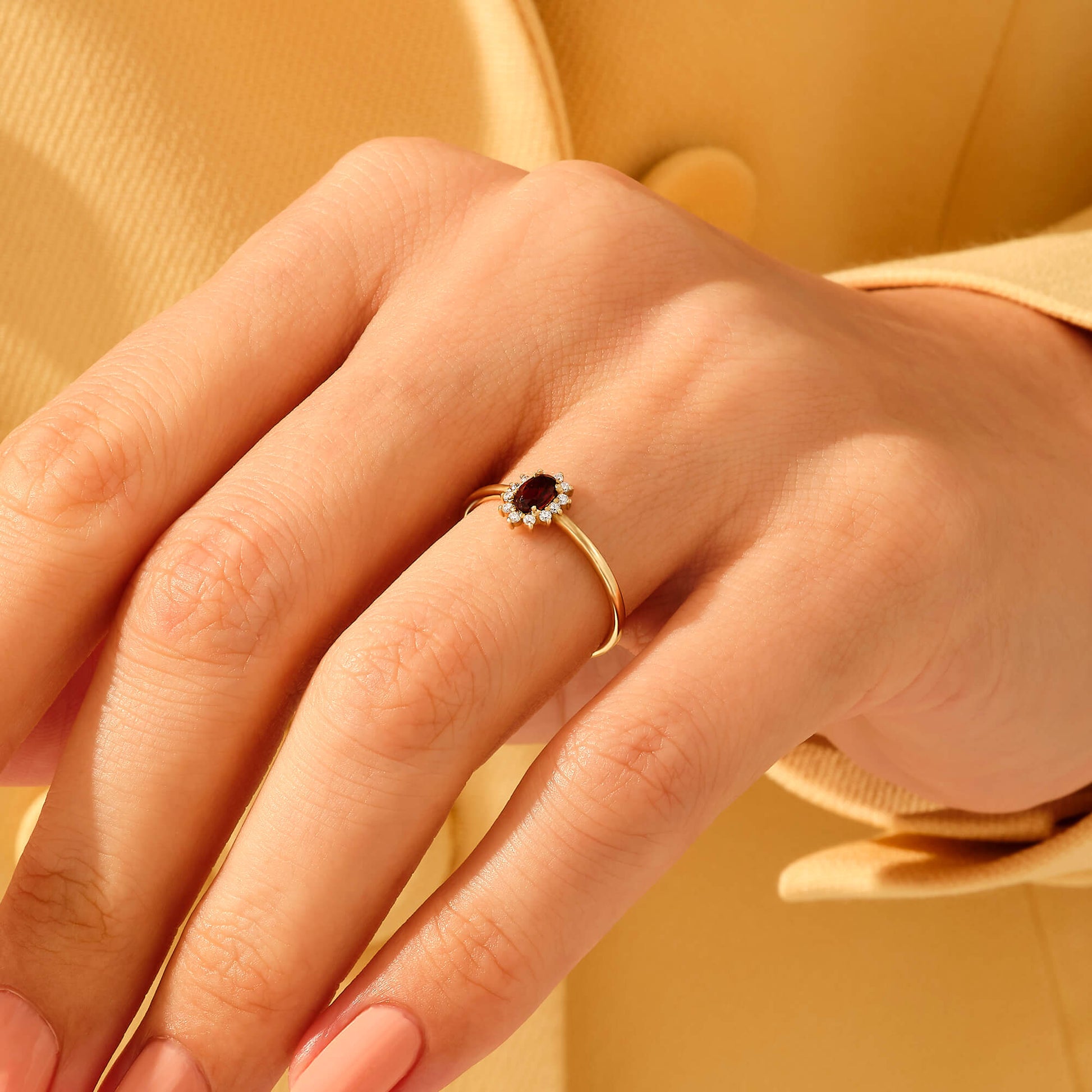 The Minimalist Garnet Oval Ring features a rich garnet poised at its center, gently framed by a halo of shimmering stones that glow like embers at dusk. It feels intimate yet luminous, a piece that whispers rather than shouts. Slip it on and let its haloed warmth become your quiet confidence.