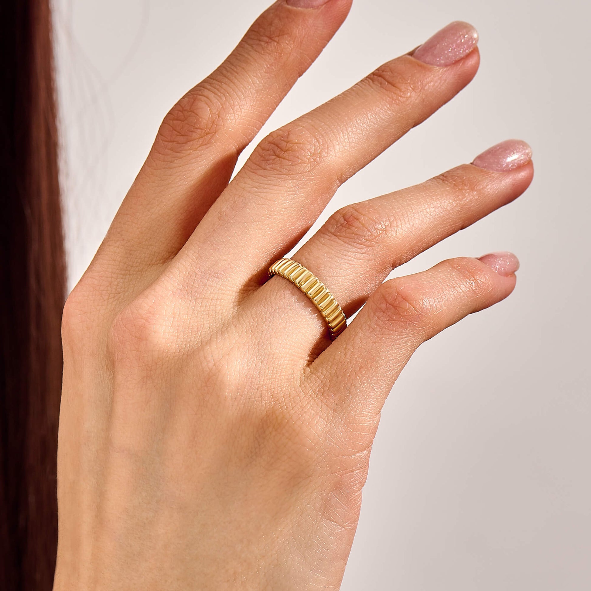 Elevate your ensemble with our Minimalist Iconic Dome Ring. This exquisite ring features a line dome design that adds an artistic touch, making it a standout accessory. Perfect for symbolizing the eternal bond, this timeless piece exudes sophistication and grace.