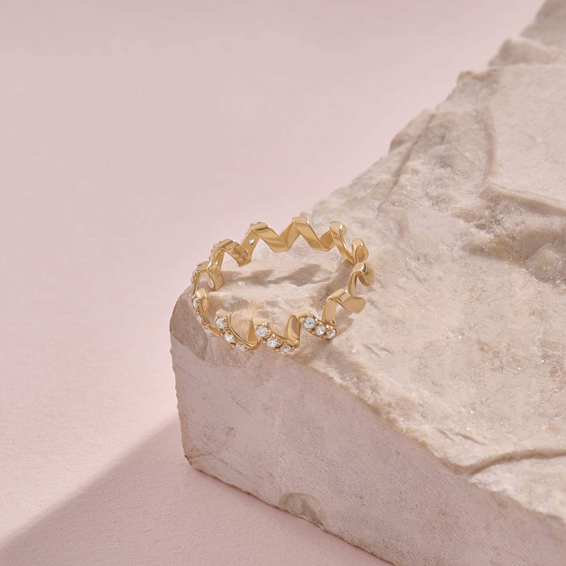 The Moissanite Twirl Ring combines modern design with timeless sparkle. Featuring a graceful swirling band that wraps around the finger, it’s accented by brilliant moissanite stones for sustainable shine. A versatile piece that can be worn solo or stacked for a more expressive style.