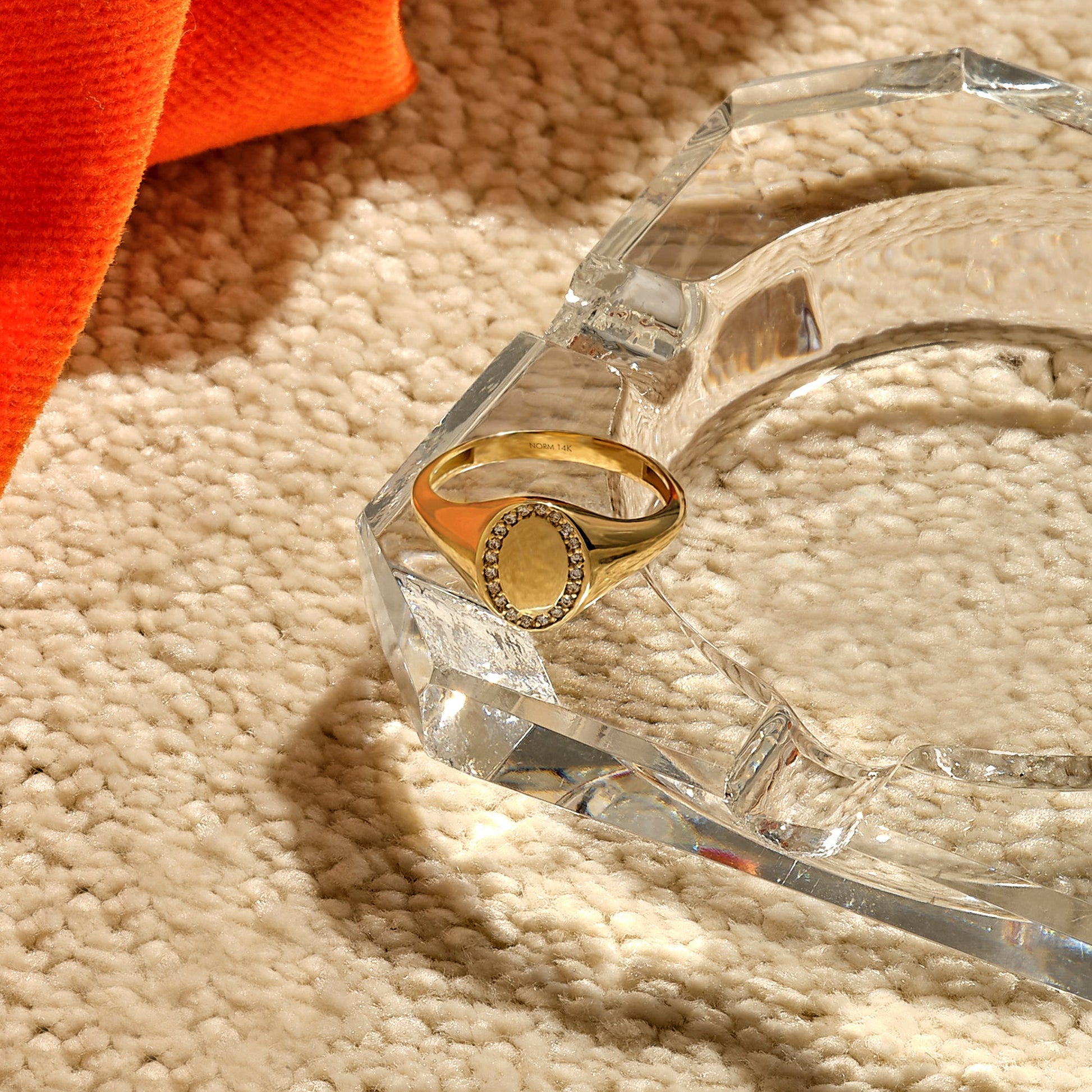 The Oval Pave Signet Ring is the pinnacle of minimalist design and elegant rings. Its plainness and modesty embellished with tiny sparkling stones will fascinate the people around you. It is perfect for everyday use.
