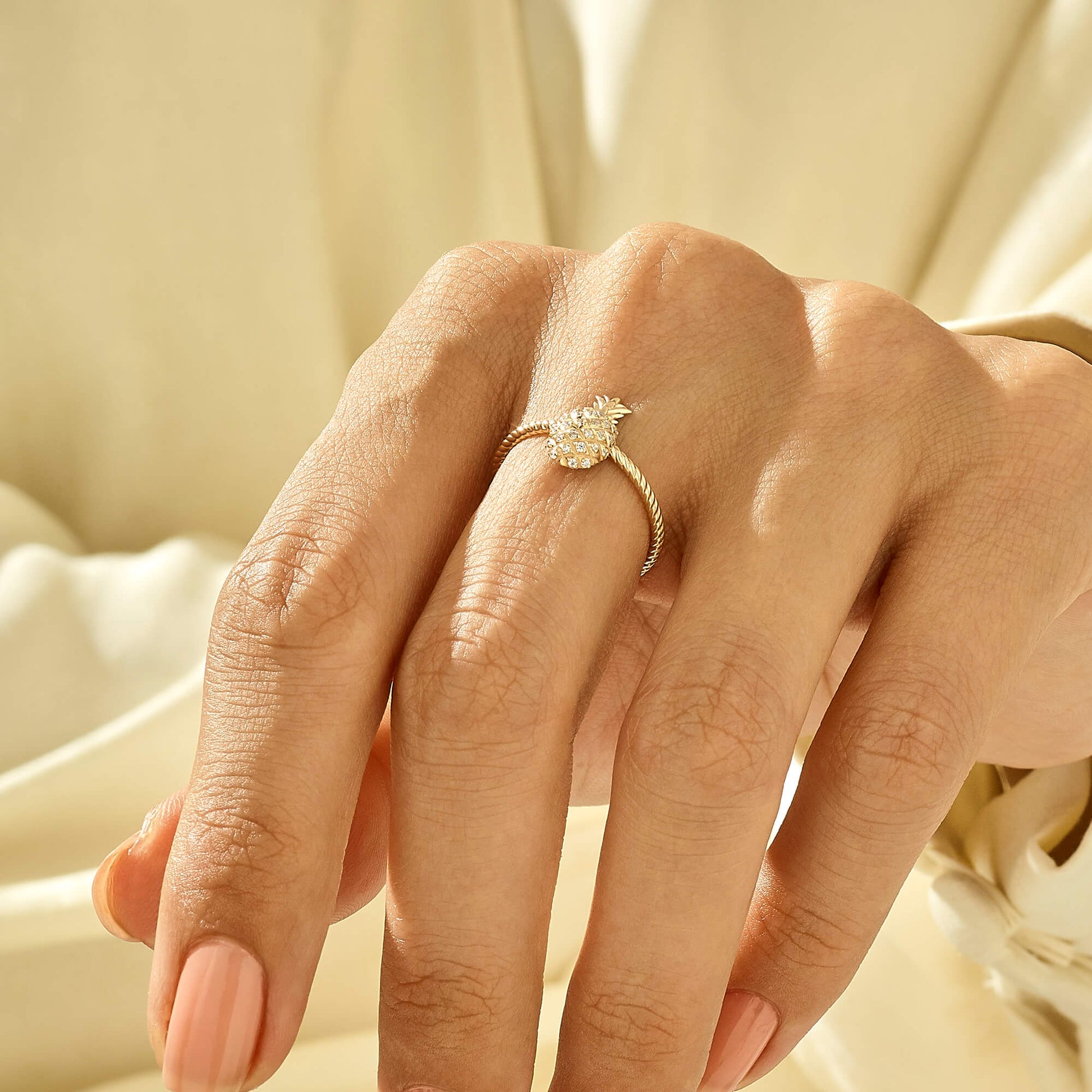 Delicate yet bold, this Pineapple Ring brings a playful twist to your ensemble. The pineapple motif, adorned with glistening stones, adds a touch of whimsy and sophistication. It's perfect for those who appreciate the fusion of fun and elegance in their accessories.