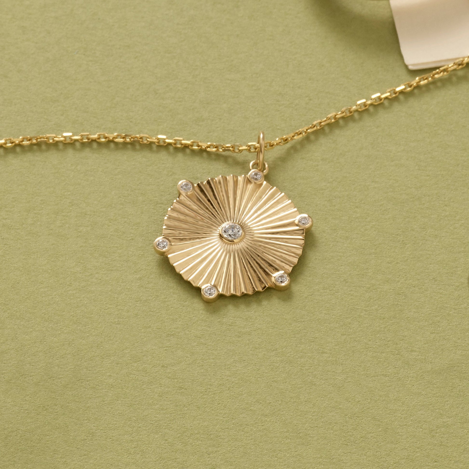 This Pave Sun Necklace makes a stylish statement. It features a radiant sun-shaped design adorned with shimmering, pave-set cubic zirconia stones that capture and reflect the light. Whether worn alone or layered with other necklaces, this pendant adds a touch of style and sparkle to any ensemble.