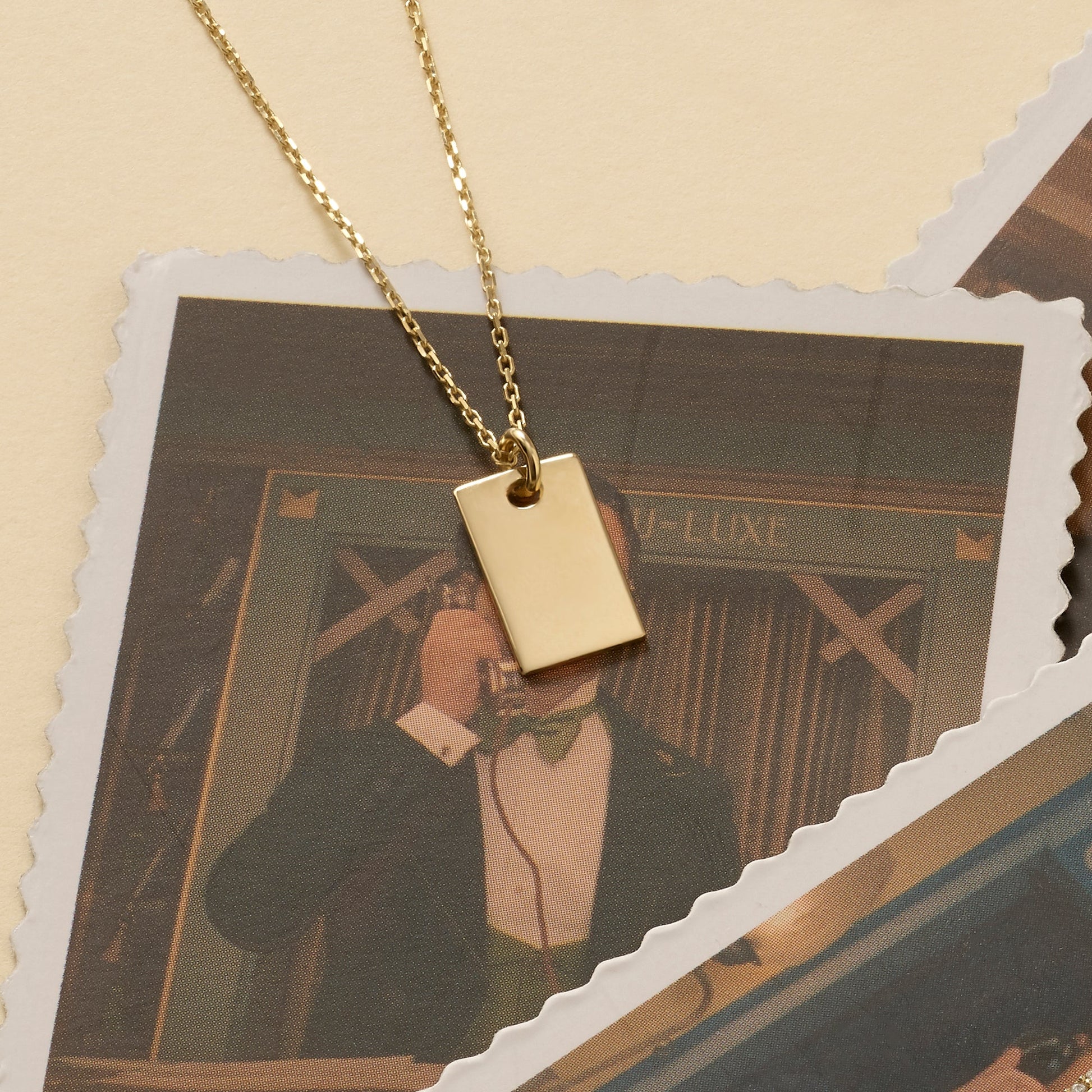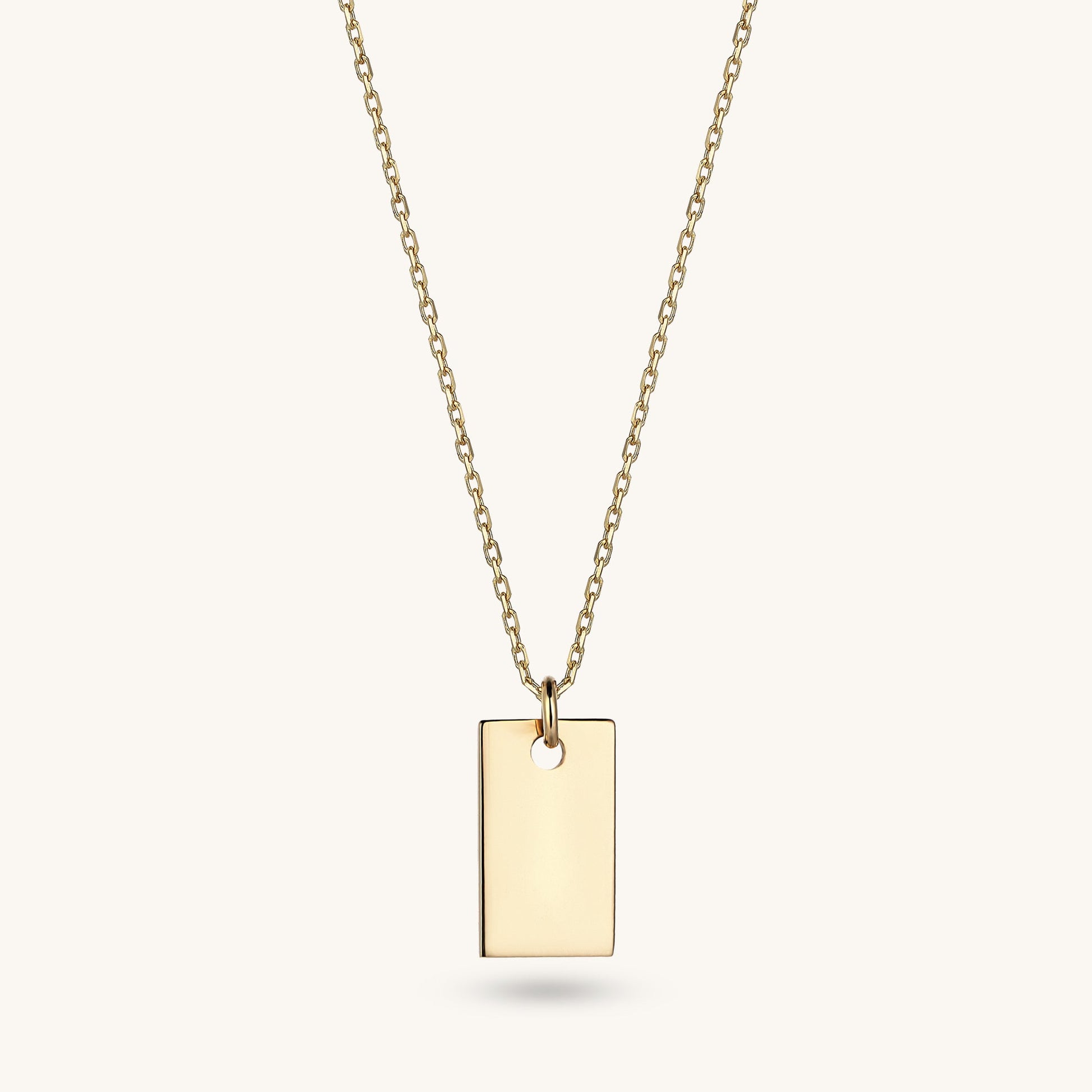 This Rectangle Tag Necklace is an elegant and timeless accessory that features a plain tag design that can be engraved, which is perfect for adding a personal touch to your outfit. The Rectangle Tag Pendant is a timeless piece that will never go out of style.