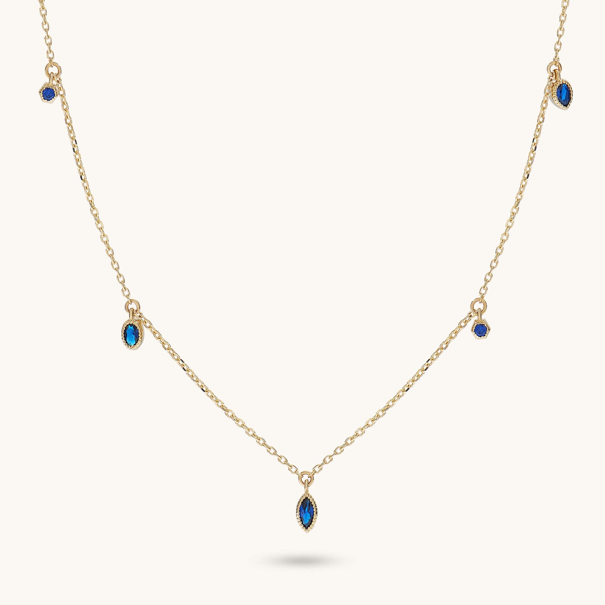 The Sapphire Bezel Station Necklace drapes the neckline with calm intention—bezel-set sapphires perched like a quiet compass point, grounded on a delicate gold chain. It feels like a talisman of clarity. Wear it to carry that sense of calm direction, day in and day out.