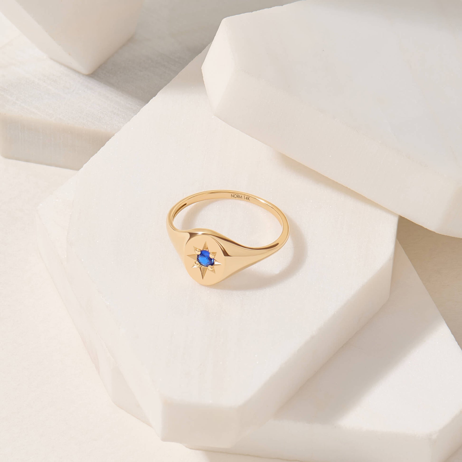 Guided by the stars, our Sapphire North Star Signet Ring is a symbol of direction and destiny. This timeless piece features a delicately carved North Star, accented with a sparkling sapphire. It’s a beautiful blend of celestial elegance and beauty.