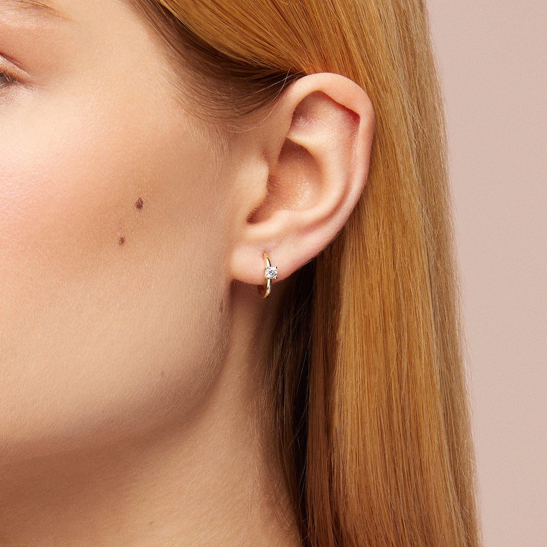 A timeless blend of elegance and simplicity, the Solitaire Earrings feature a single sparkling stone at their center. These huggie earrings are meticulously designed to maintain effortless sophistication.