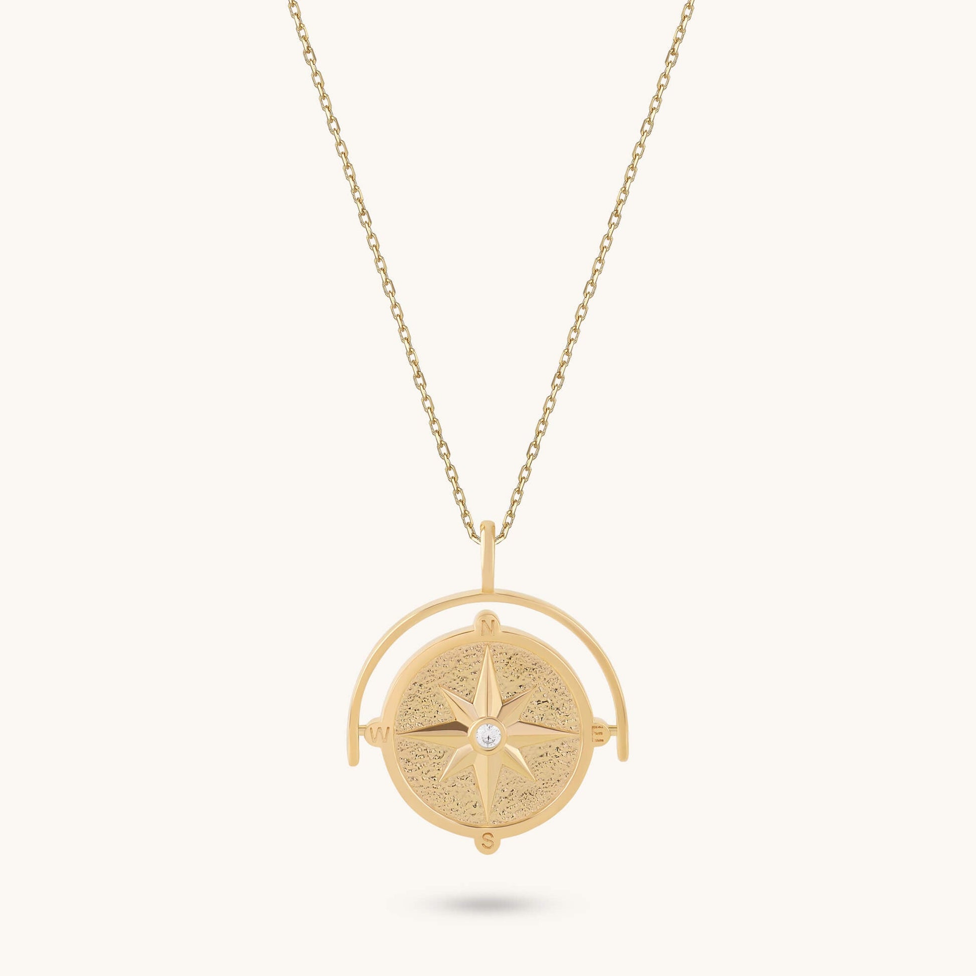 Inspired by travel and discovery, the Spinner Compass Necklace features a functional, rotating compass pendant. Sleek and contemporary, it adds subtle intrigue and a touch of wanderlust to any outfit.