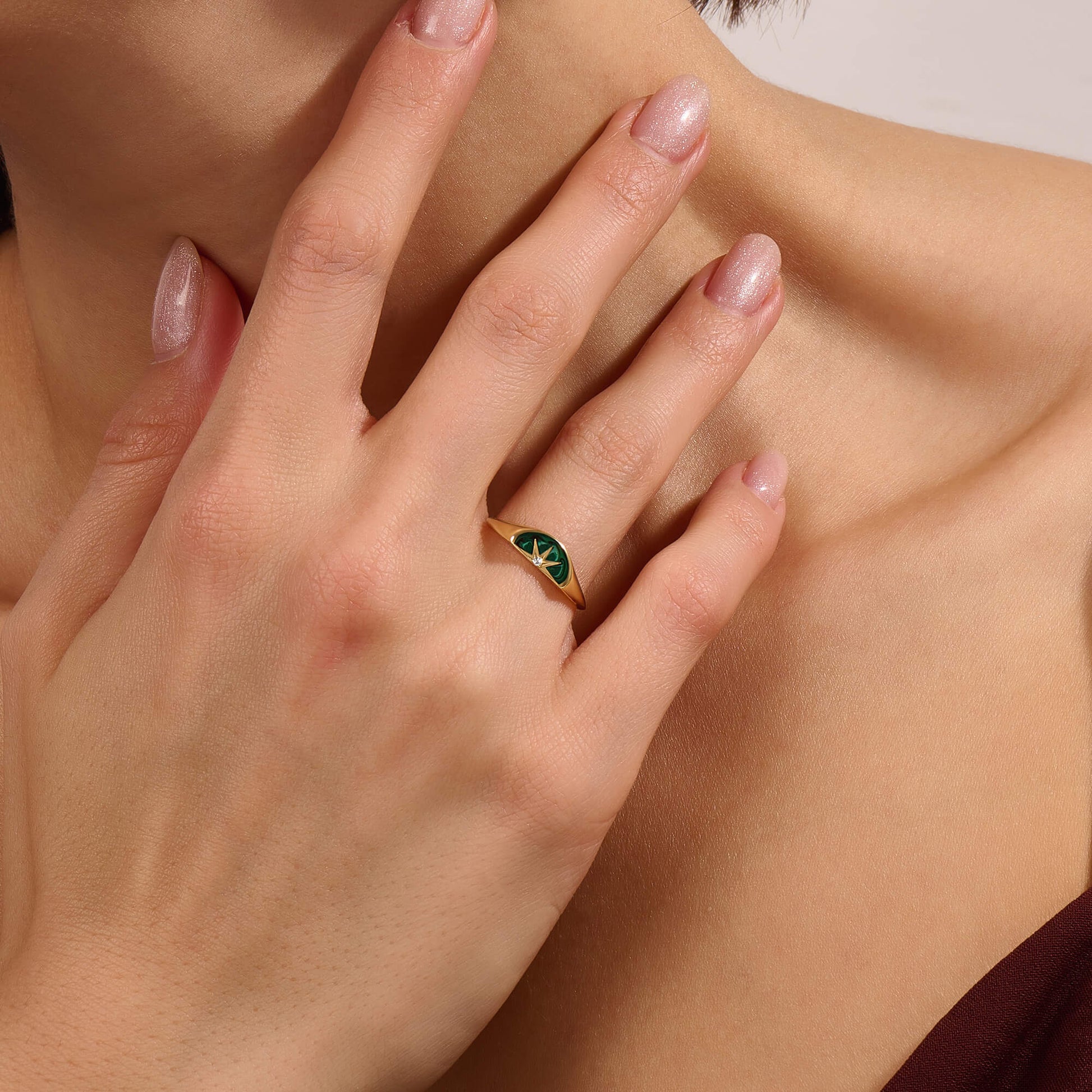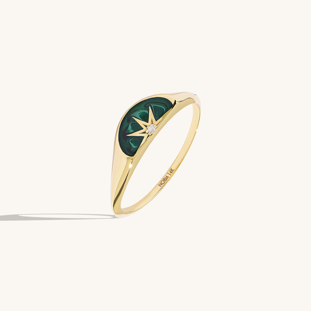 Introducing our Sun Green Enamel Half Signet Ring – a celestial marvel for the modern individual. This unique ring features a half signet design finished with vibrant green enamel and adorned with a captivating gold sun motif. This piece combines cosmic inspiration with timeless elegance, making it a symbol of guidance and individuality. Elevate your look with the celestial beauty of the Sun Green Enamel Half Signet Ring.