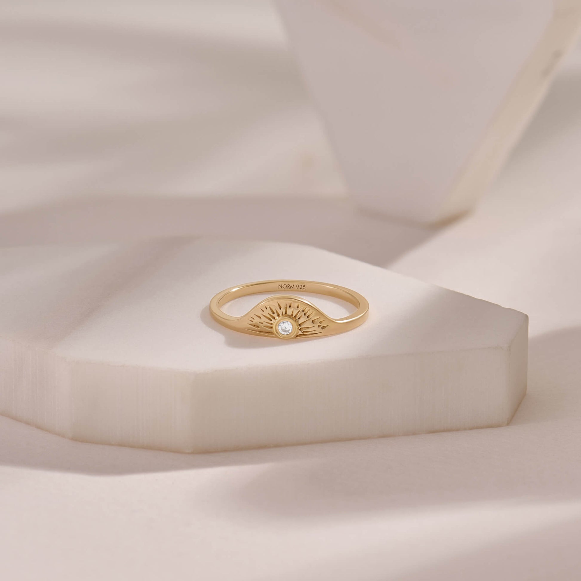 Distinctive, versatile, and modern. The Sunset Half Signet Ring plays with balance—pairing smooth shine with sculpted texture. An iconic and fresh signet ring design to elevate your style.