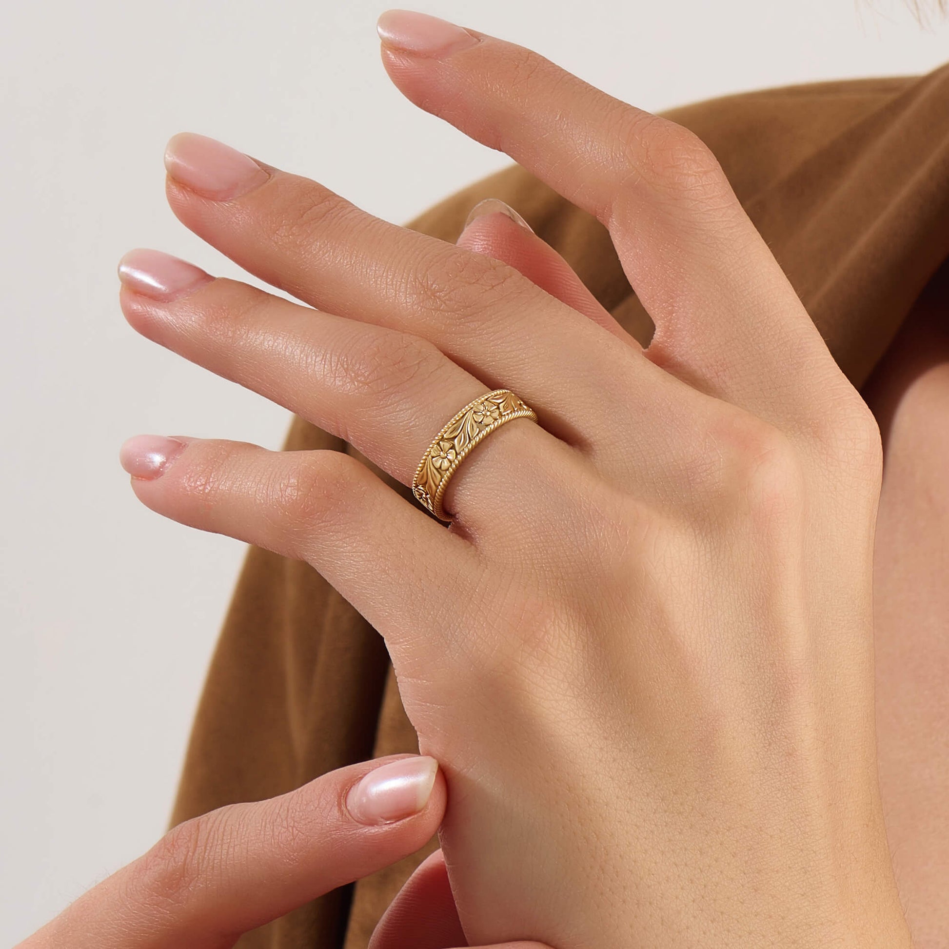 The Vintage Flower Band Ring is a delicate blend of timeless charm and feminine elegance. The detailed floral design gives it a vintage look, making it a charming accessory for those who love nature-inspired jewelry with a touch of history. It’s a graceful piece to wear solo or stacked with other rings.